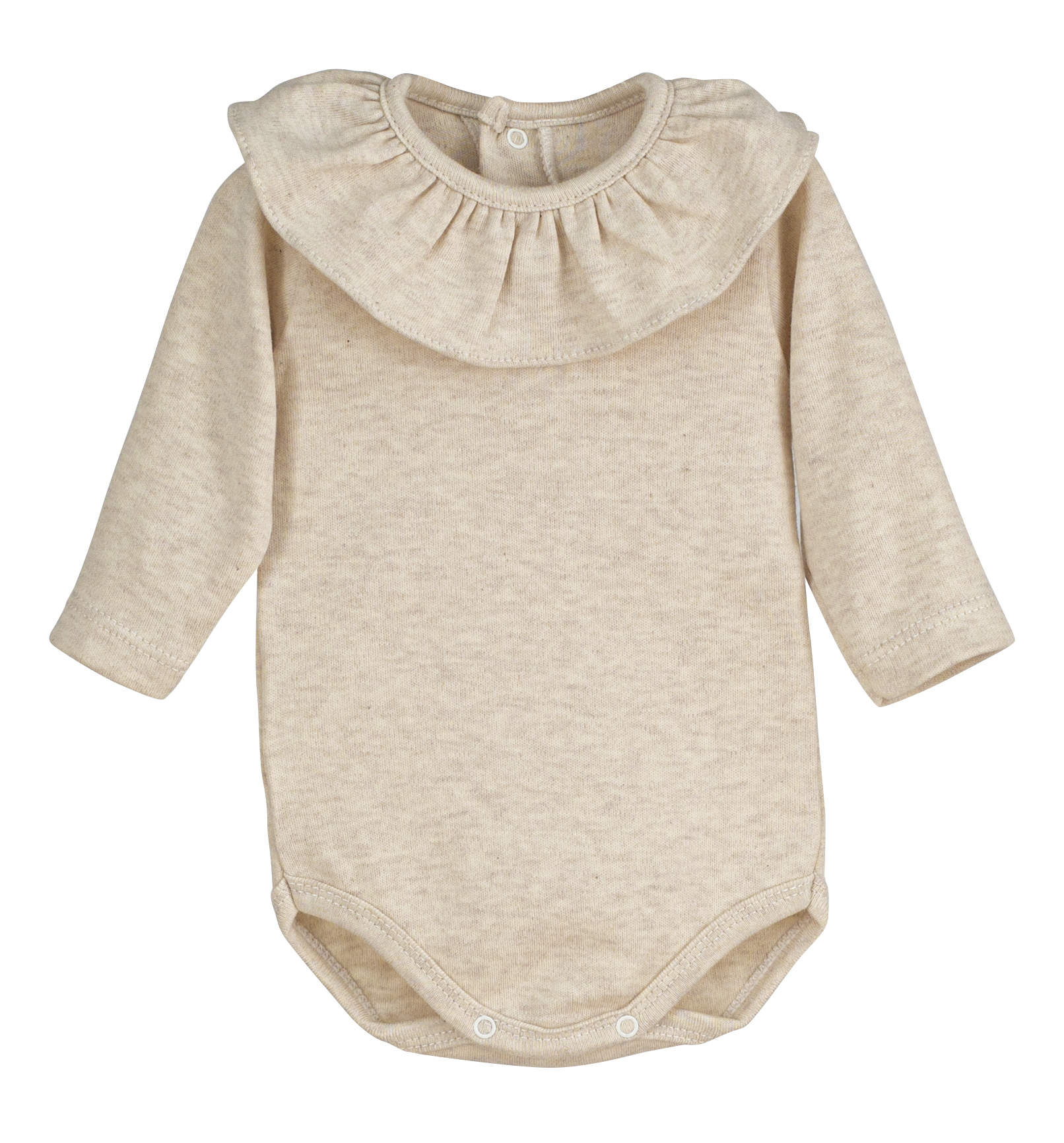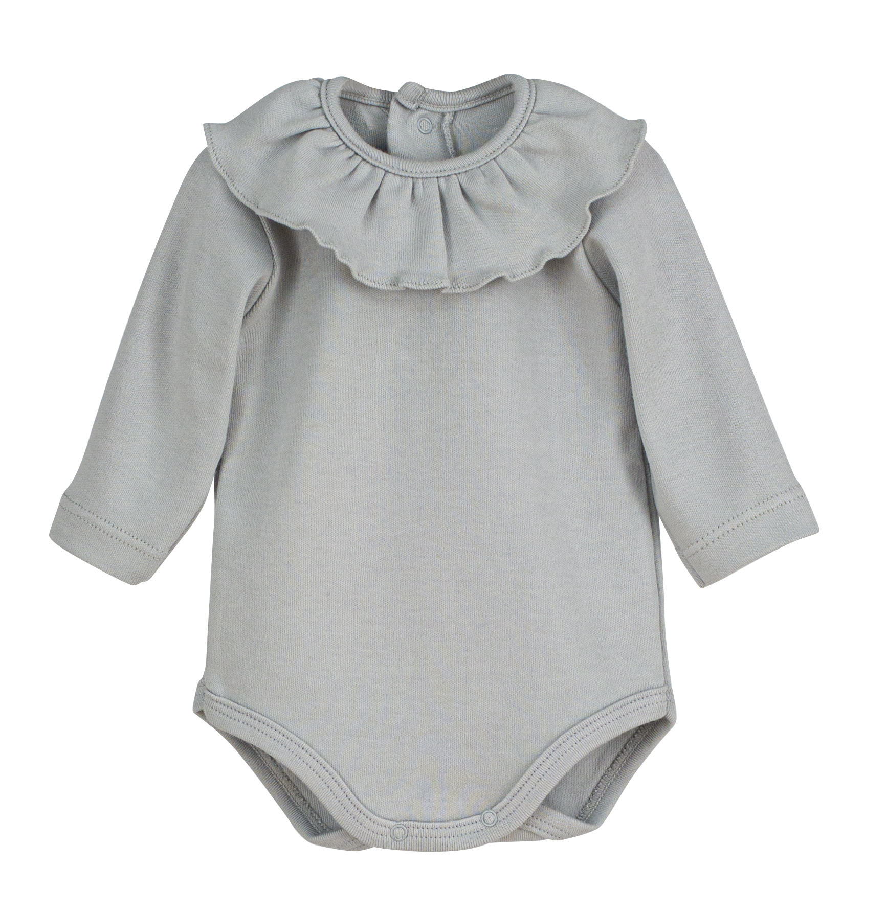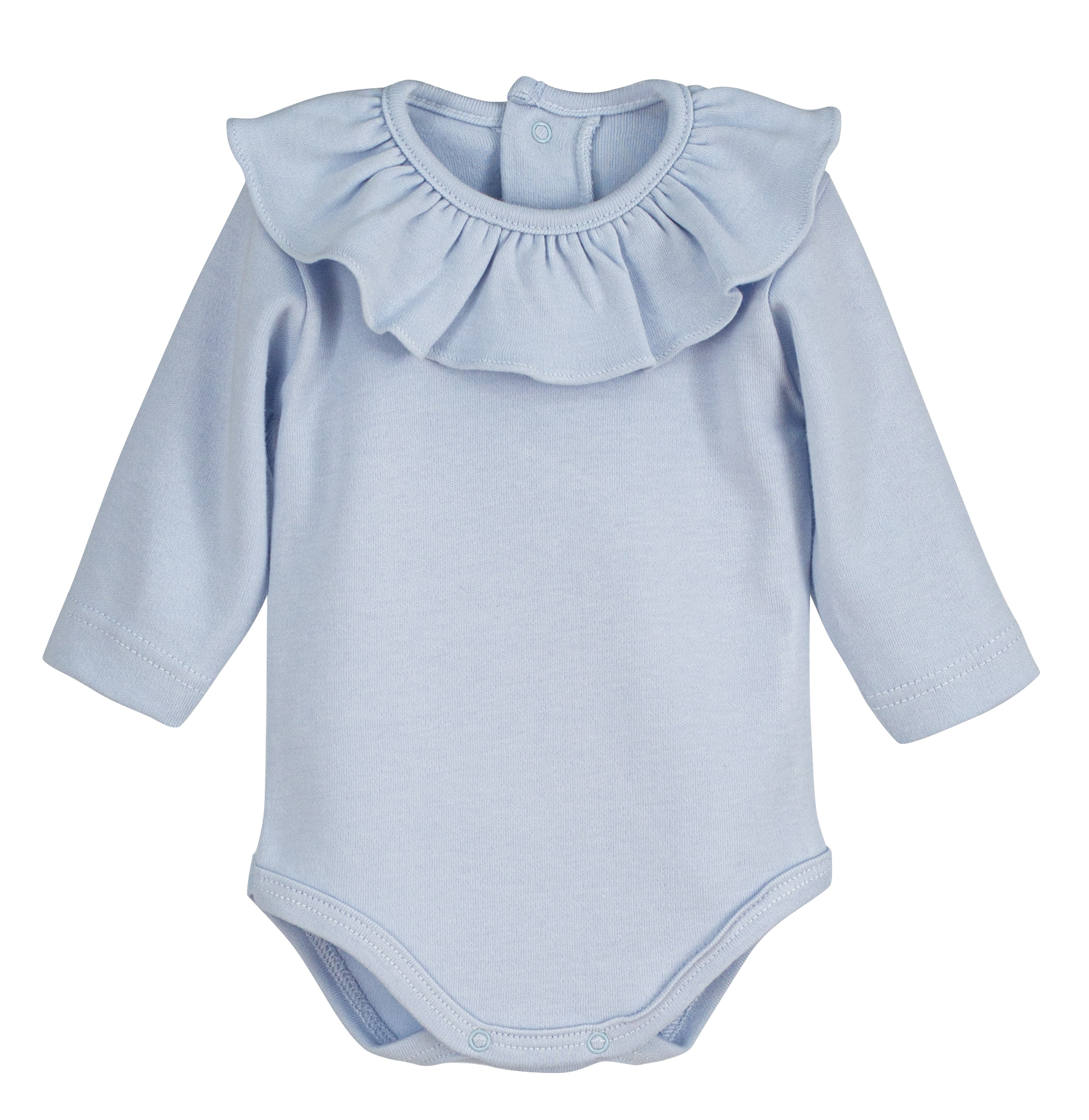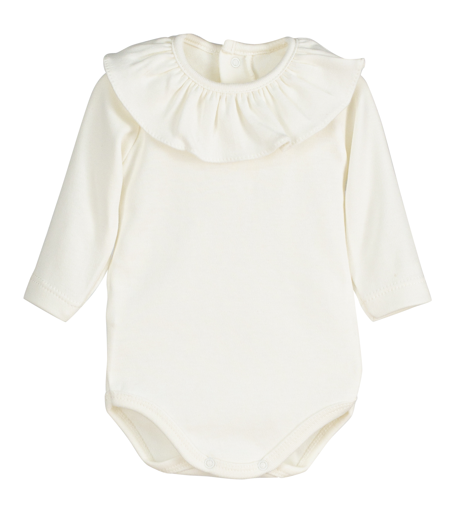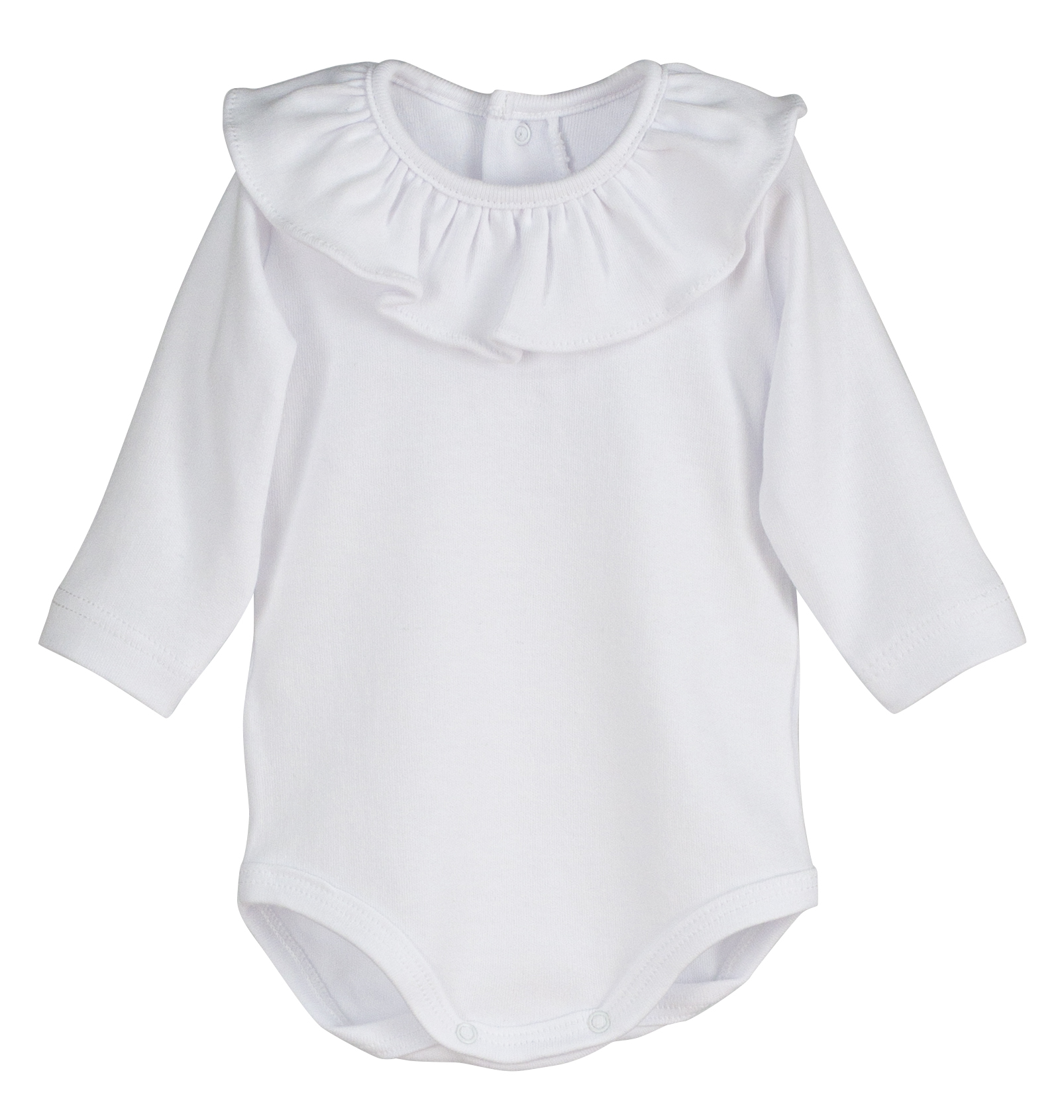Body de algodón, manga larga y cuello de volante. Se abre en el escote por detrás con dos automáticos y por abajo con automáticos también.