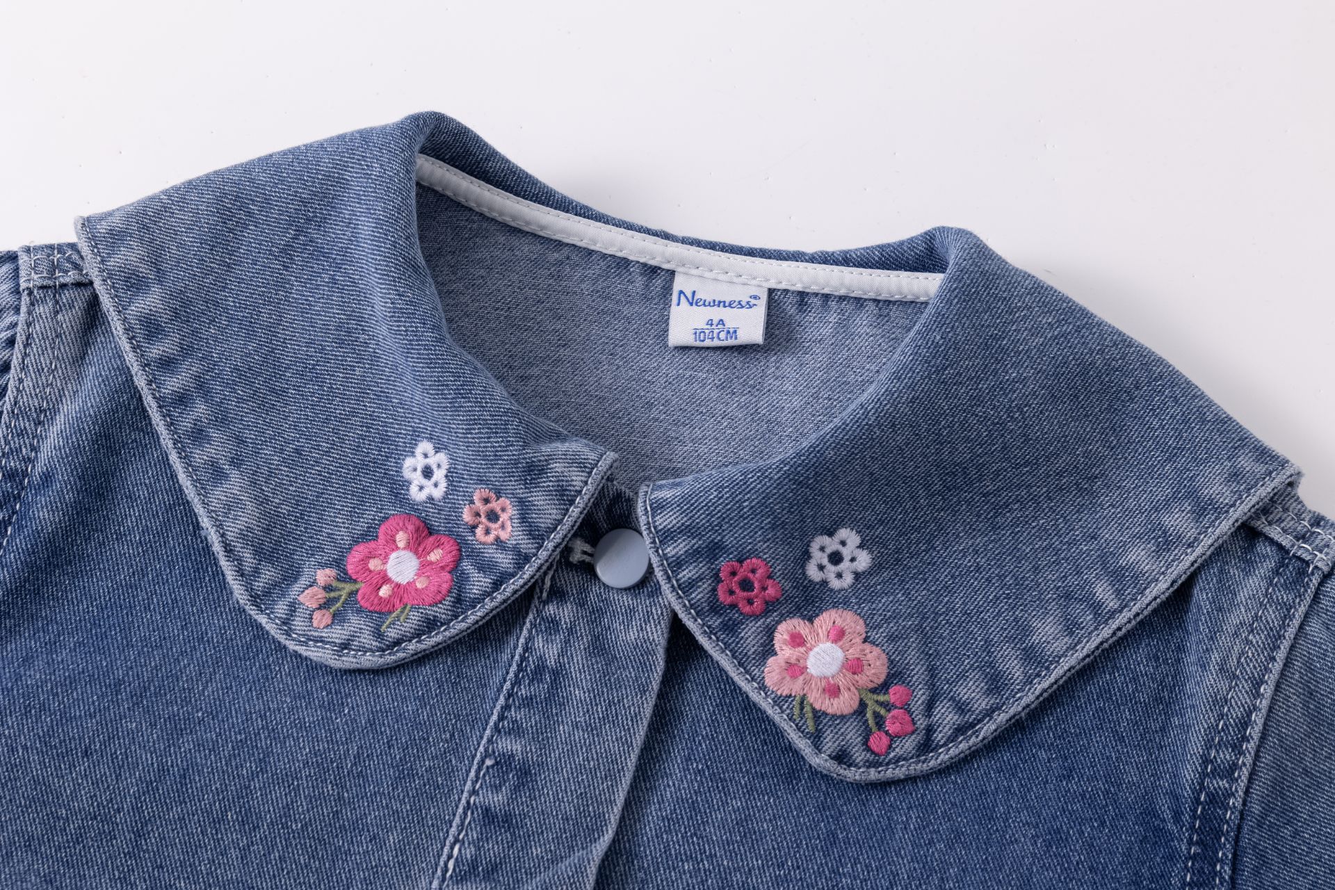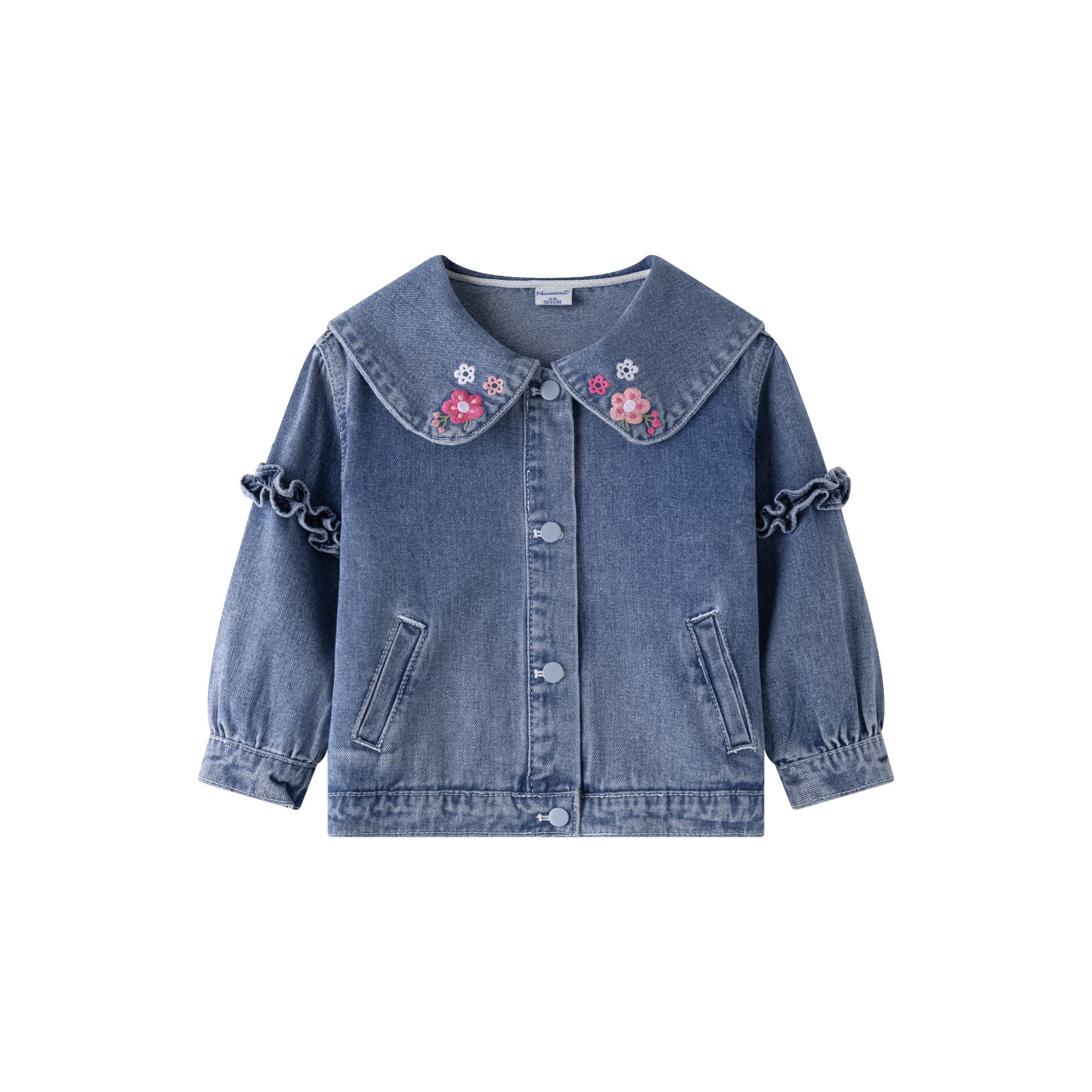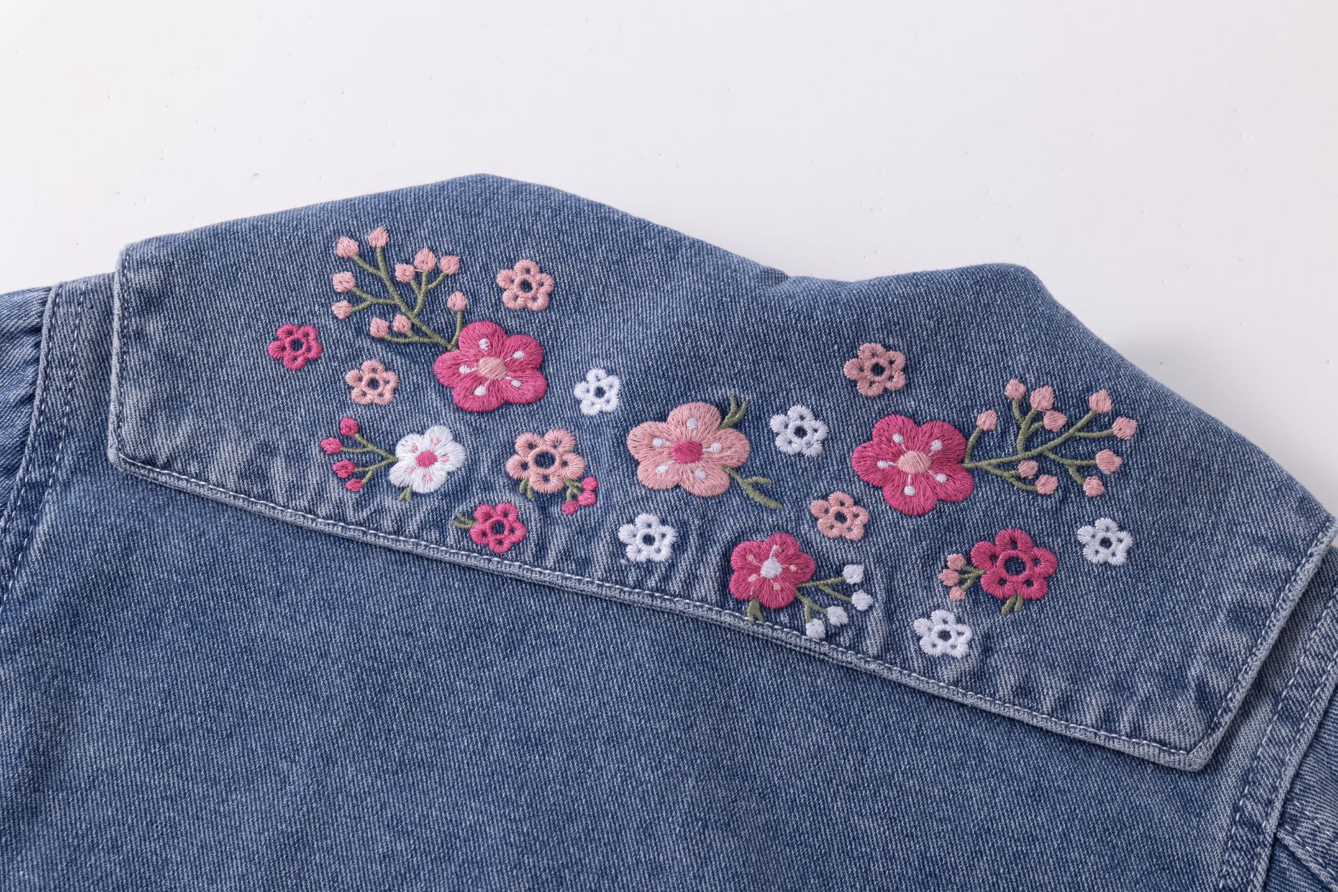 Cazadora vaquera super elástica, con cuello baberola bordado en flores rosas, volante a media manga. Clip automáticos para el cierre.