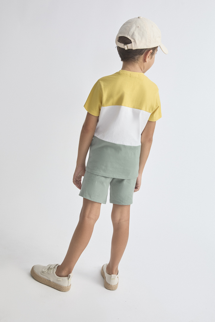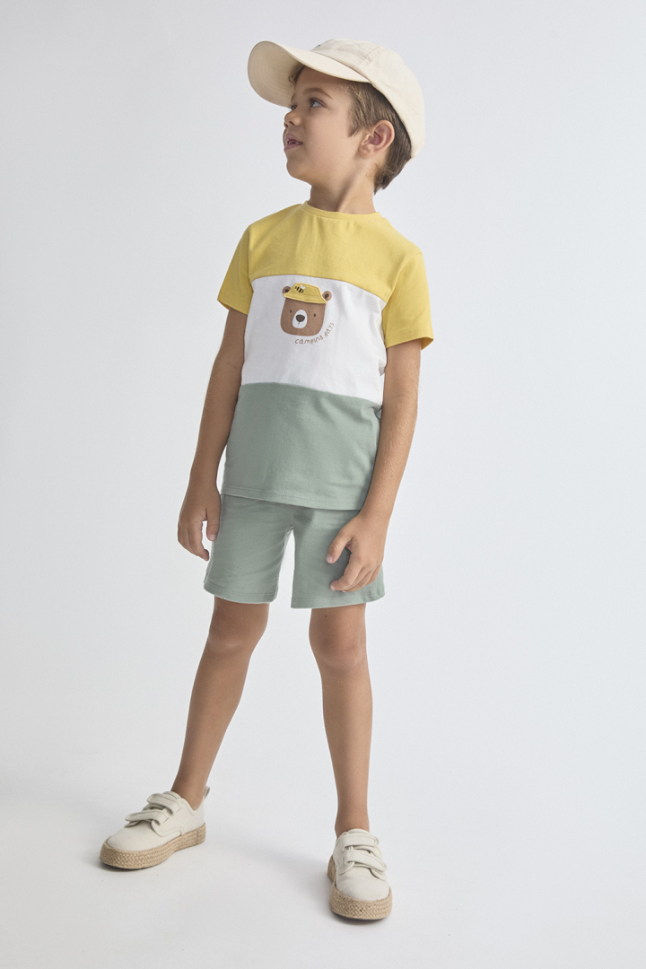 Camiseta estampado frontal oso manga corta a rayas anchas en mostaza, blanco y verde, cuello a la caja con abertura en hombro y pantalón verde con cintura engomada.