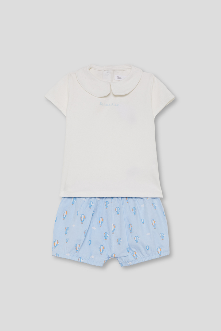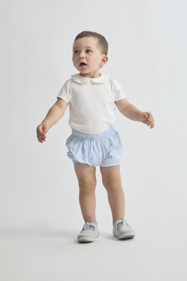 Camiseta manga corta, cuello bebe y cierre trasero con botones, ranita celeste estampado globos y cintura elástica.