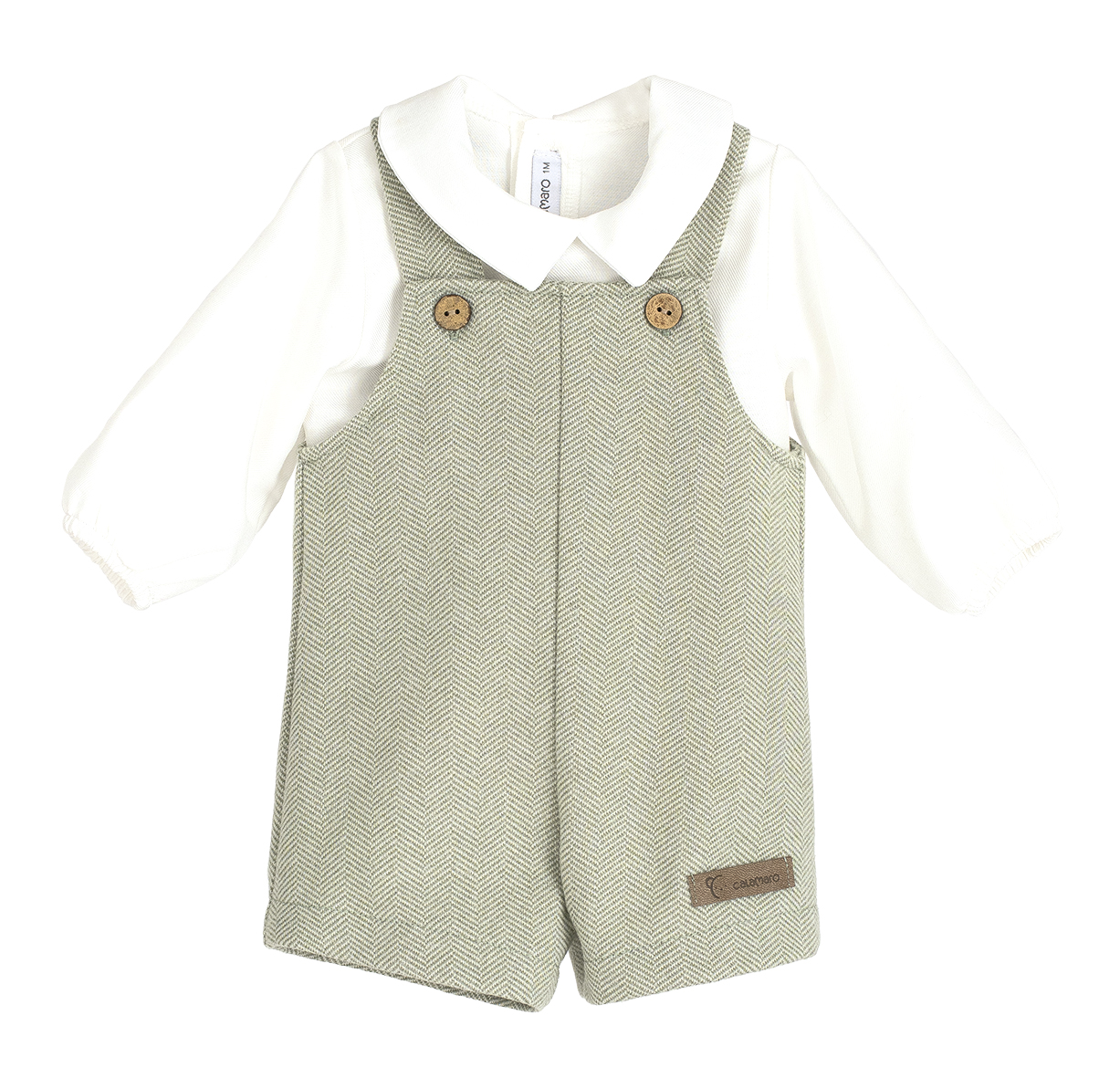 Conjunto peto con tirantes y botones, camisa manga larga cuello bebe.