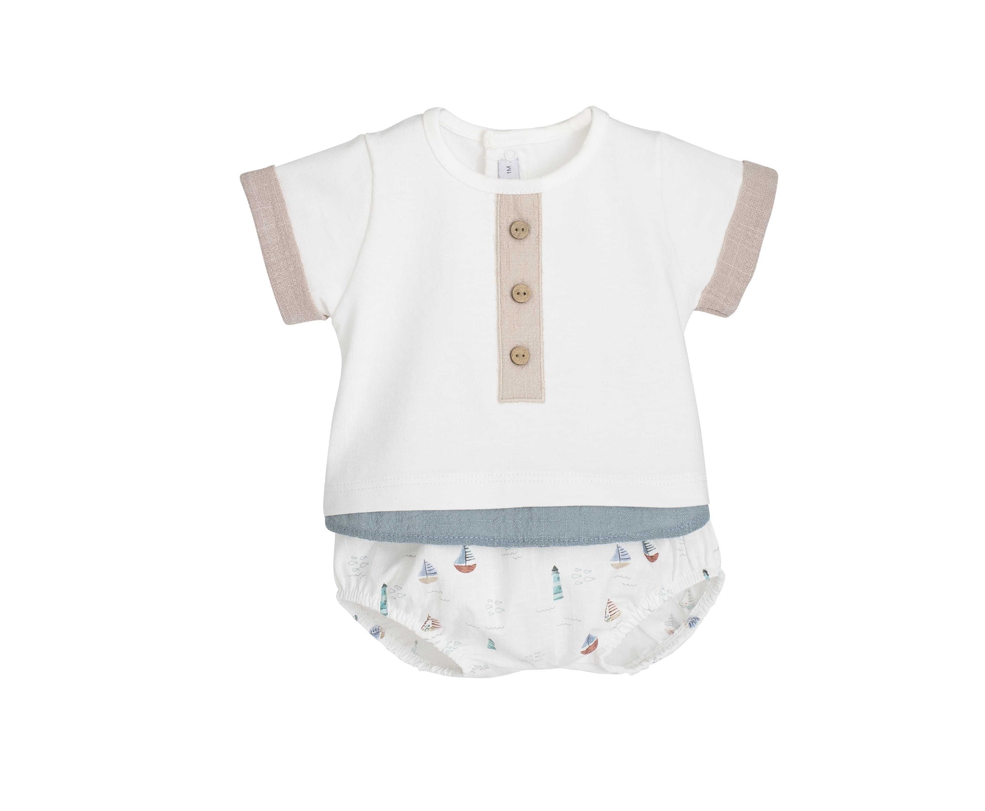Conjunto de braguita con barcos y camiseta blanca adornada en los mismos colores y botones en el delantero.
