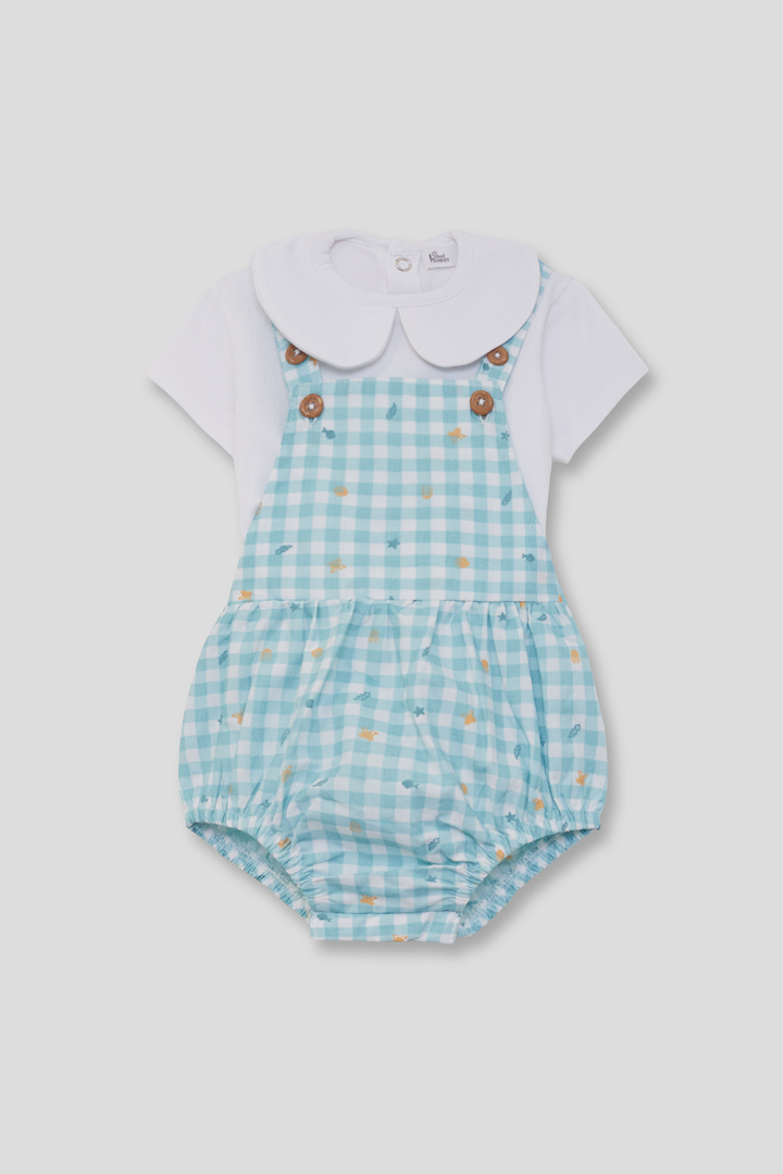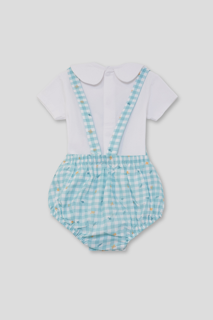 Camiseta blanca manga corta , cuello bebe, ranita cuadros vichy turquesa con motivos marinos y tirantes con botones madera.