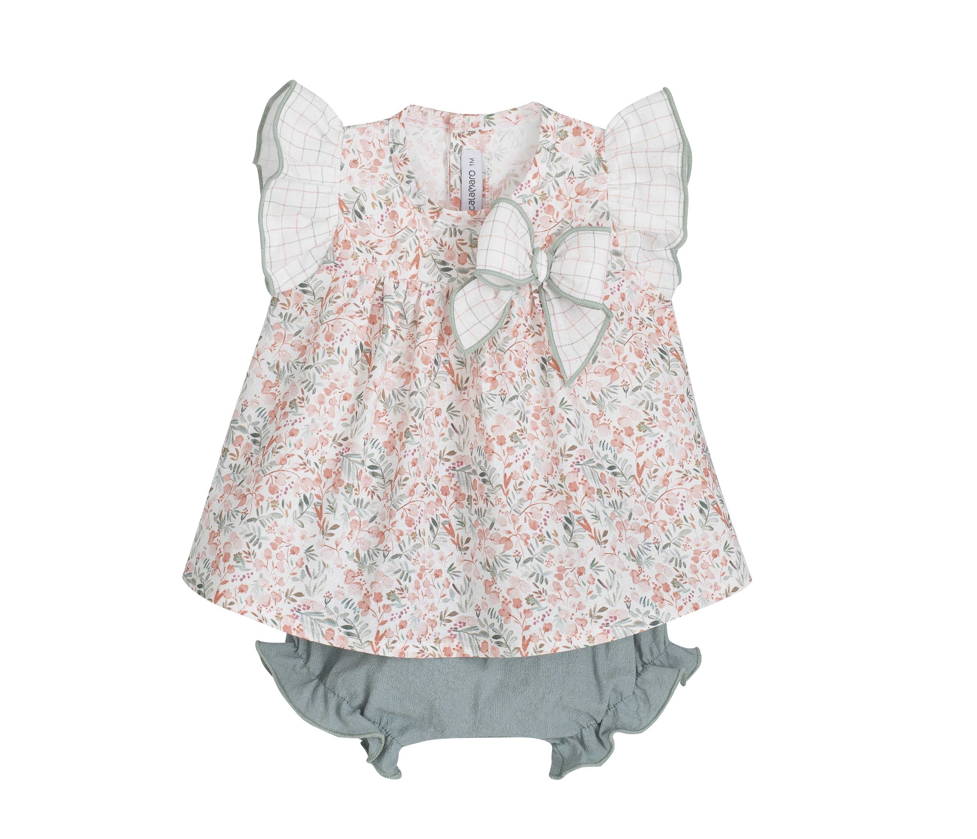 Jesusito 100 % algodón,  estampado flores, manga sisa con volante y adorno de lazo a juego, cuello a la caja y abertura por detrás.