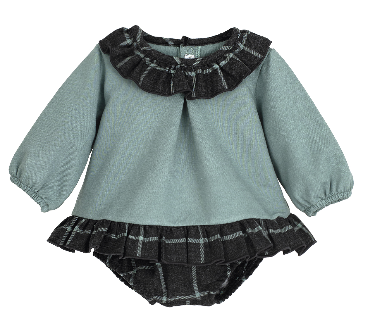 Jesusito, vestido corto con braga a juego en gris con cuadros verde agua, todo en tejido de algodón sudadera perchado por dentro.