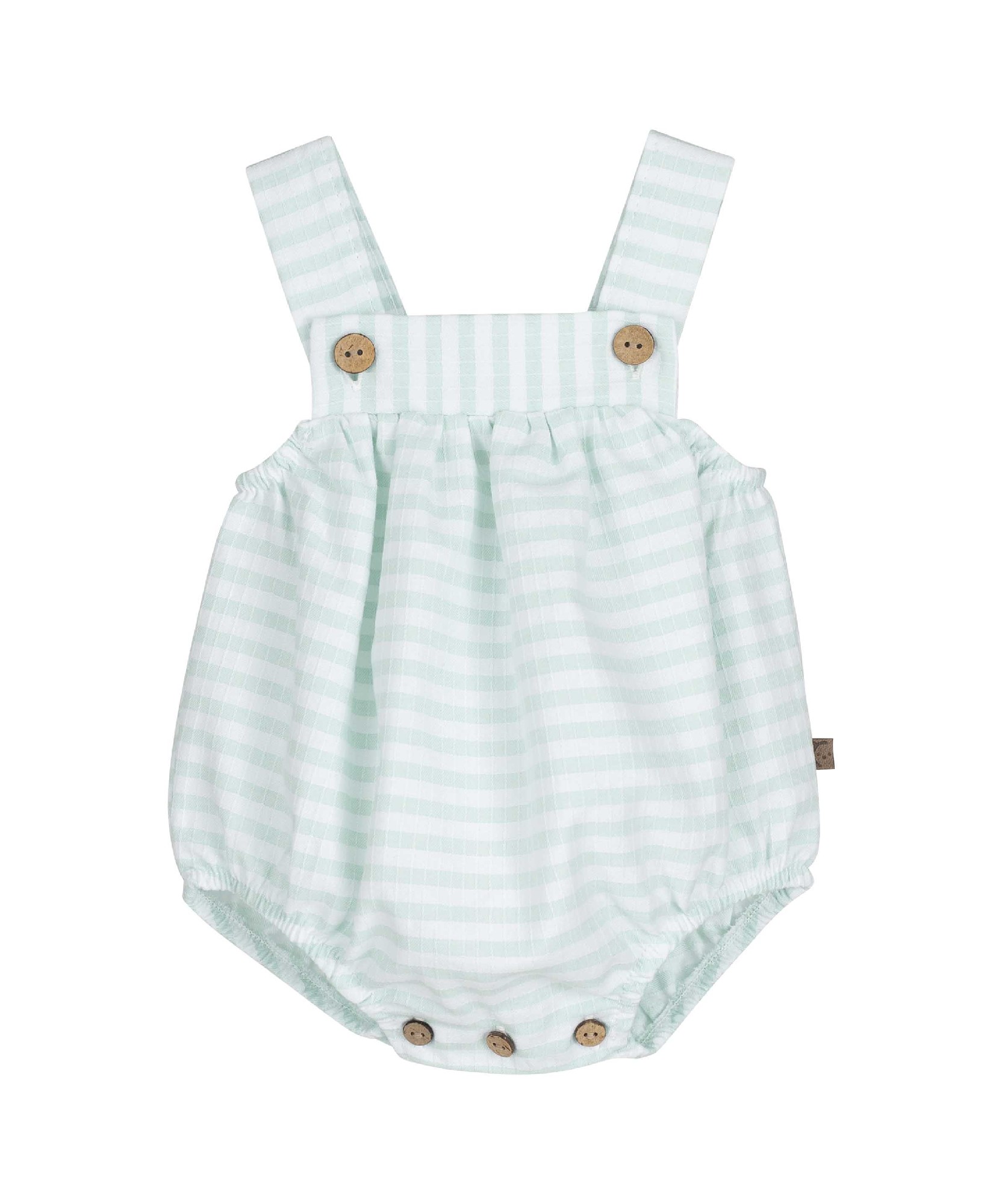 Peto ranita a rayas verde agua y blancas, tirantes con botones de madera y en la entrepierna botones de madera.
