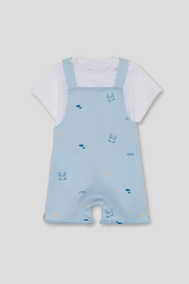 camiseta manga corta, cuello a la caja y peto corto azul estampado cangrejos, peces y soles, tejido algodón.