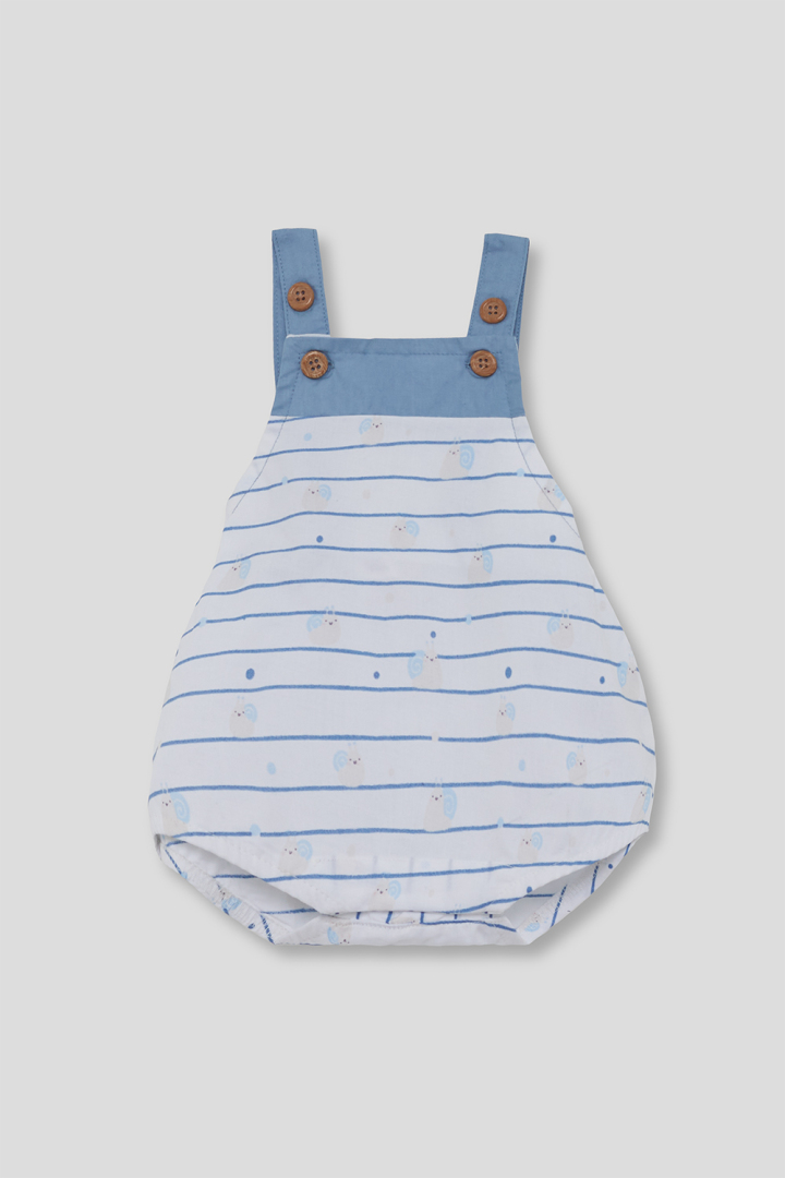 Ranita tirantes con botones en madera, estampado de caracoles y lineas azules, goma en la parte trasera para un ajuste perfecto.