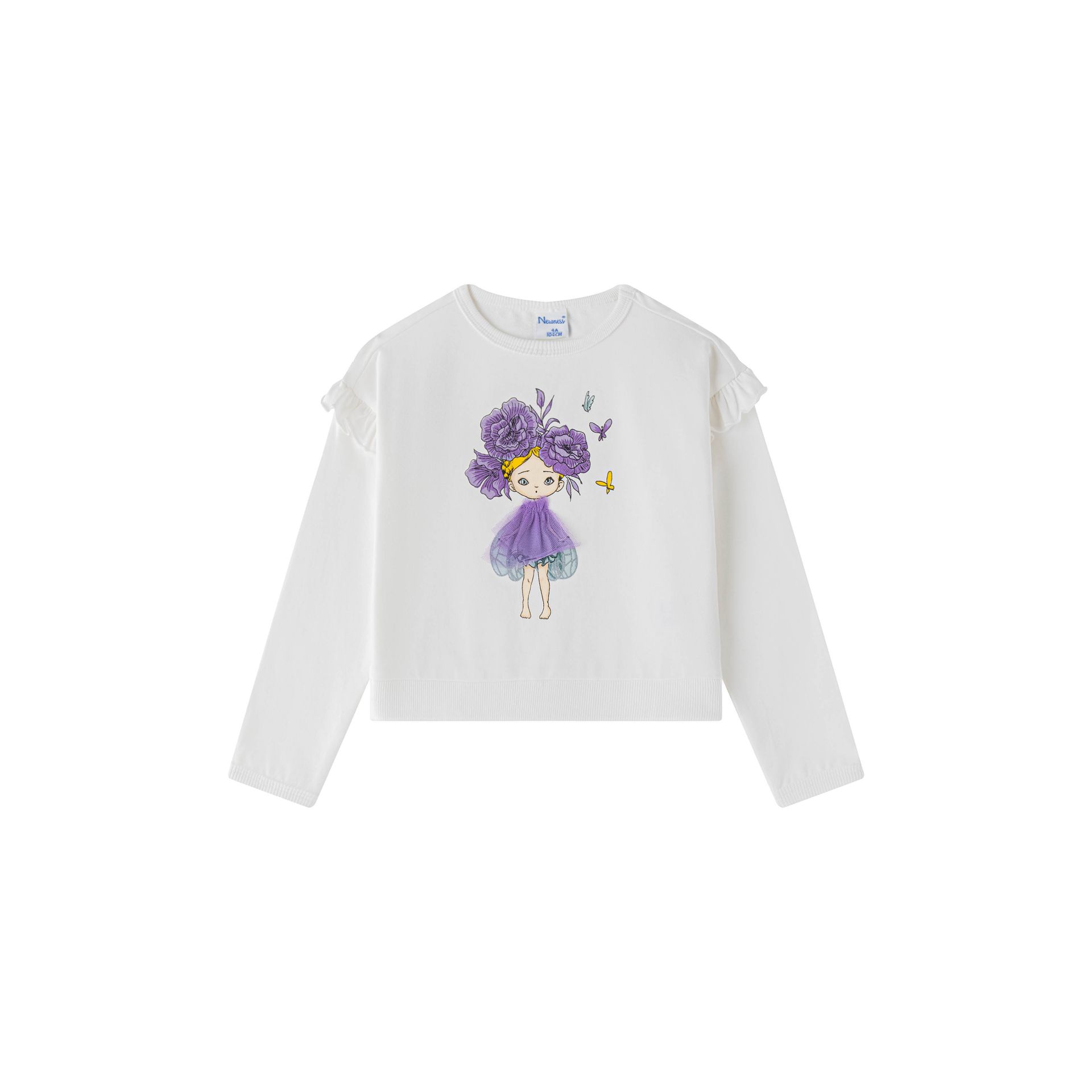 Sudadera sin percha, manga larga volante en sisa, cuello a la caja, detalle en delantero hada flores falda tul.