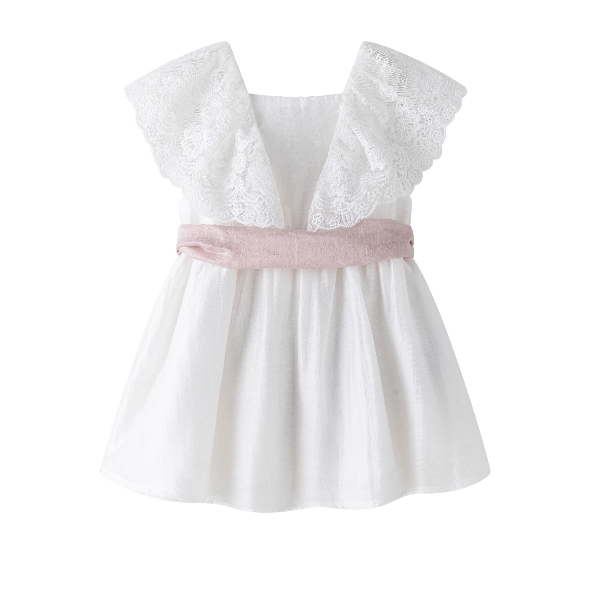 Vestido blanco tejido tipo seda tratada, manga sisa con volante de encaje, braguita cubre pañal a juego y dos cinturones en verde y rosa.