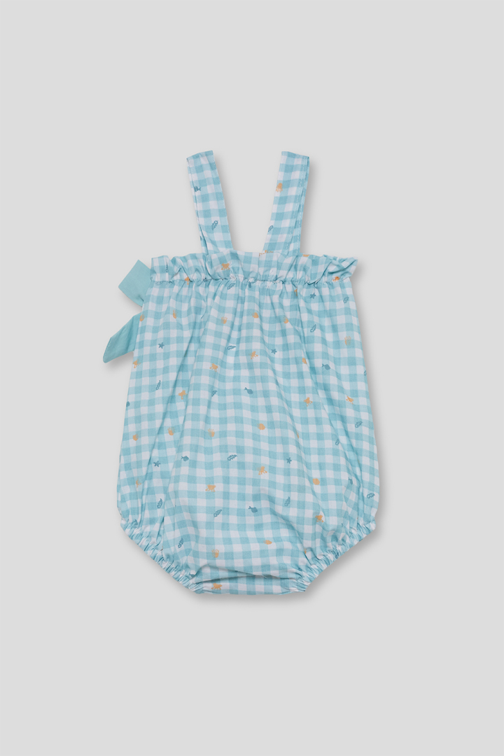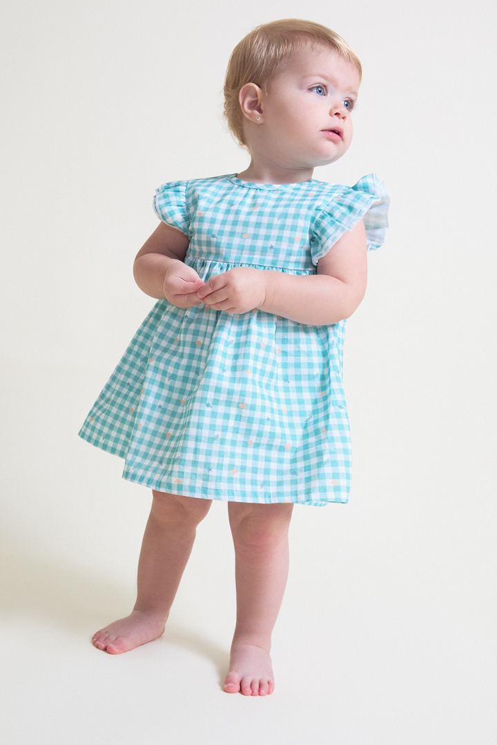 Vestido sin mangas en tejido vichy color turquesa con pequeños estampados marinos. Diseño con volantes en los hombros y lazo trasero a contraste. Incluye braguita a juego en color turquesa con cintura y perneras elásticas. Confeccionado en tejido ligero y fresco, ideal para los días de verano.