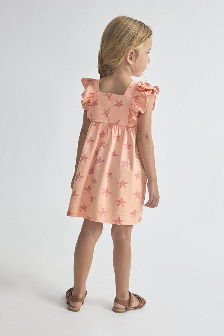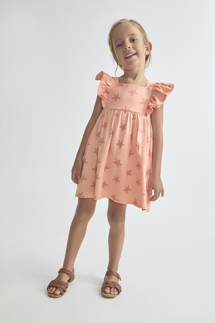 Vestido sin mangas en color salmón con estampado de estrellas de mar. Tirantes con volantes y corte con vuelo que aporta frescura y comodidad.