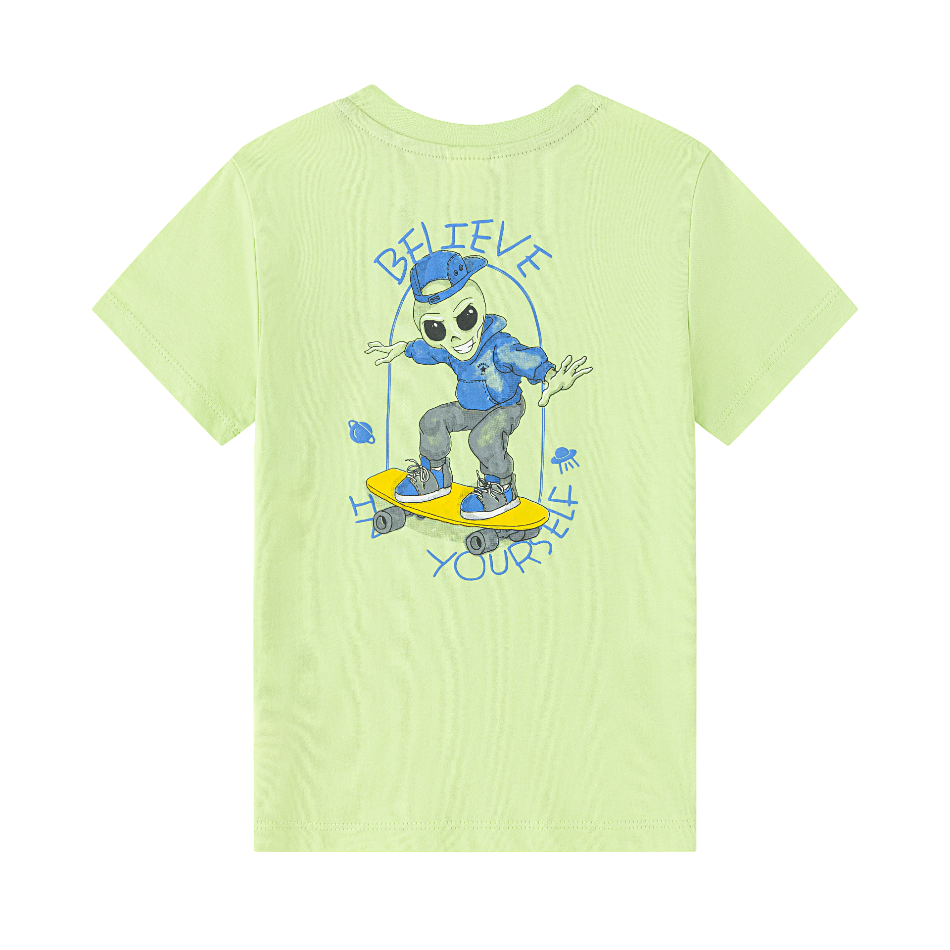 Camiseta verde pistacho dibujo alien, y alien grande en la espalda.