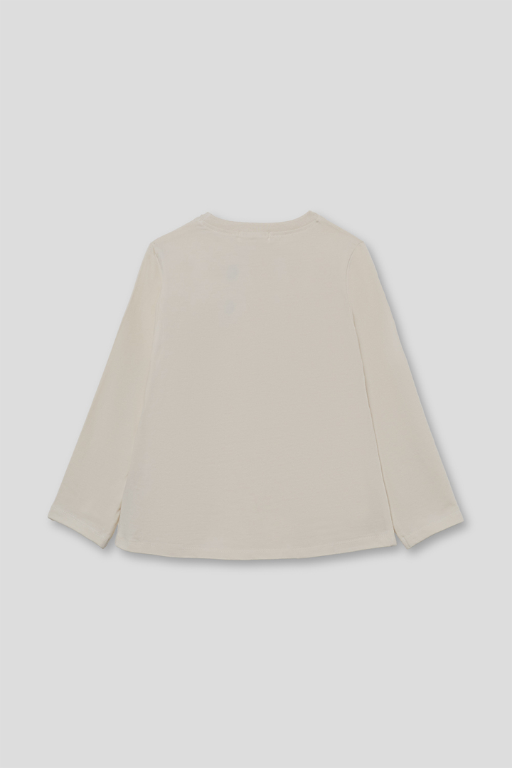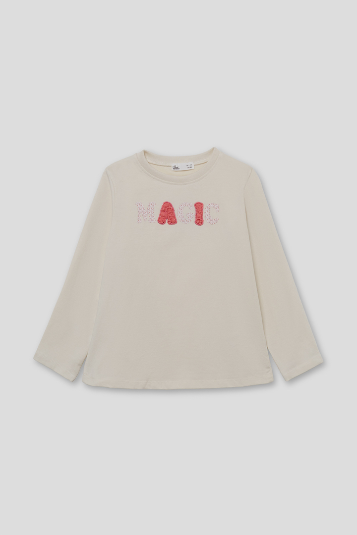 Camiseta de niña de manga larga  de punto suave con cuello redondo y detalle decorativo en el frontal con la palabra “MAGIC”. Las letras combinan estampado floral con apliques de tul fruncido y pequeñas perlas cosidas, aportando un acabado delicado y especial. Un diseño cómodo con un toque mágico para el día a día.