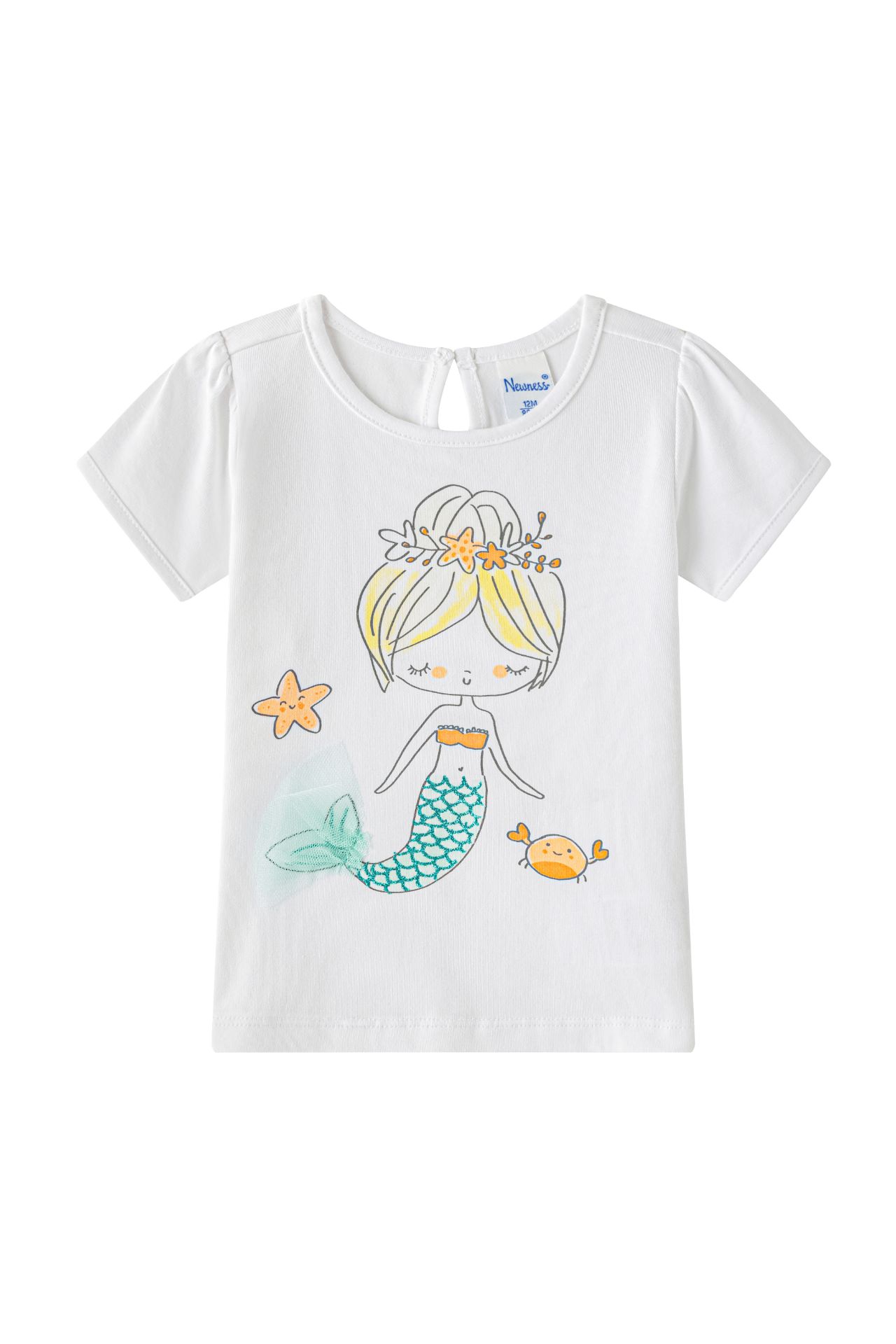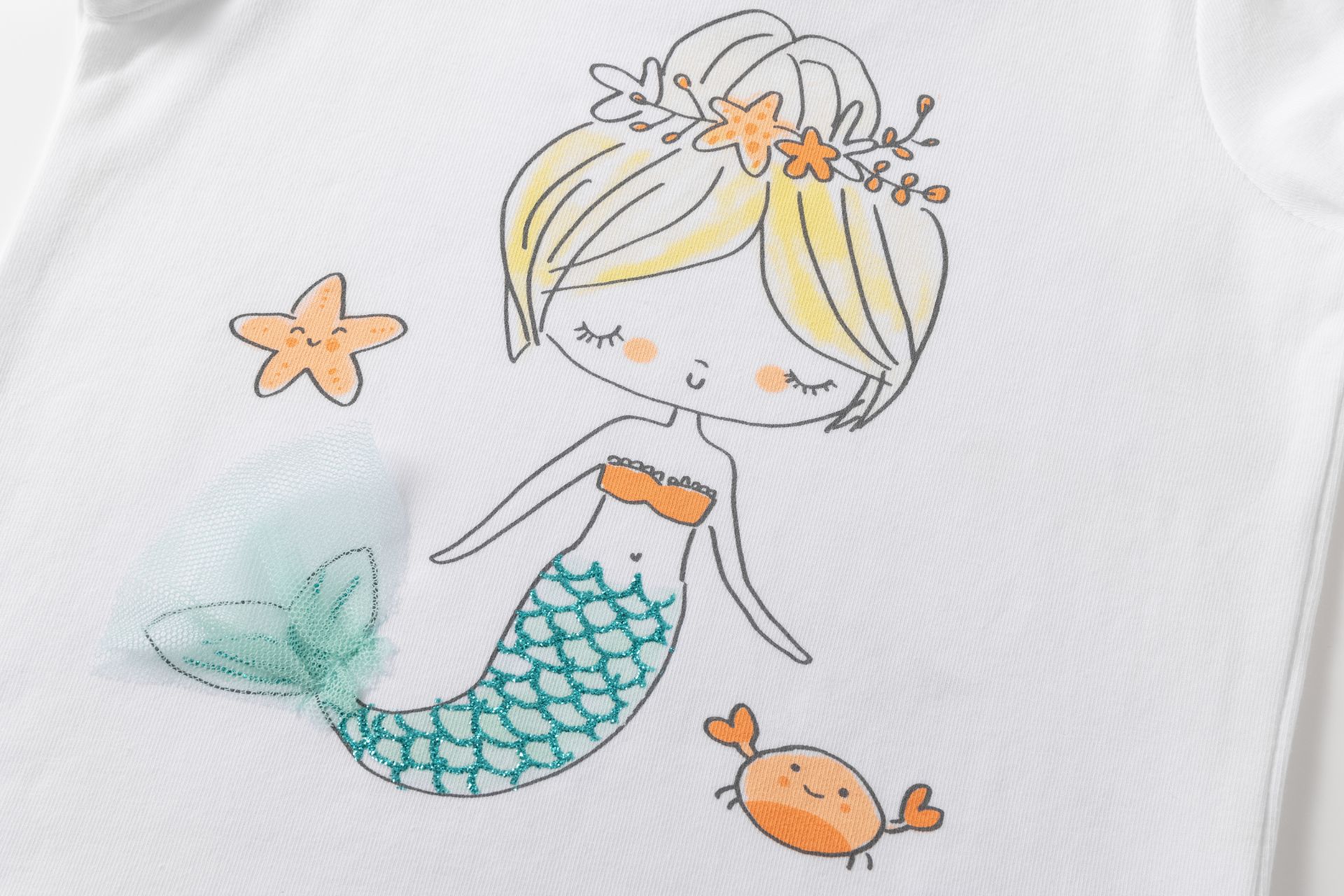 Camiseta estampado sirenita con tul en el final de la cola, cuello a la caja con botón, mana corta.