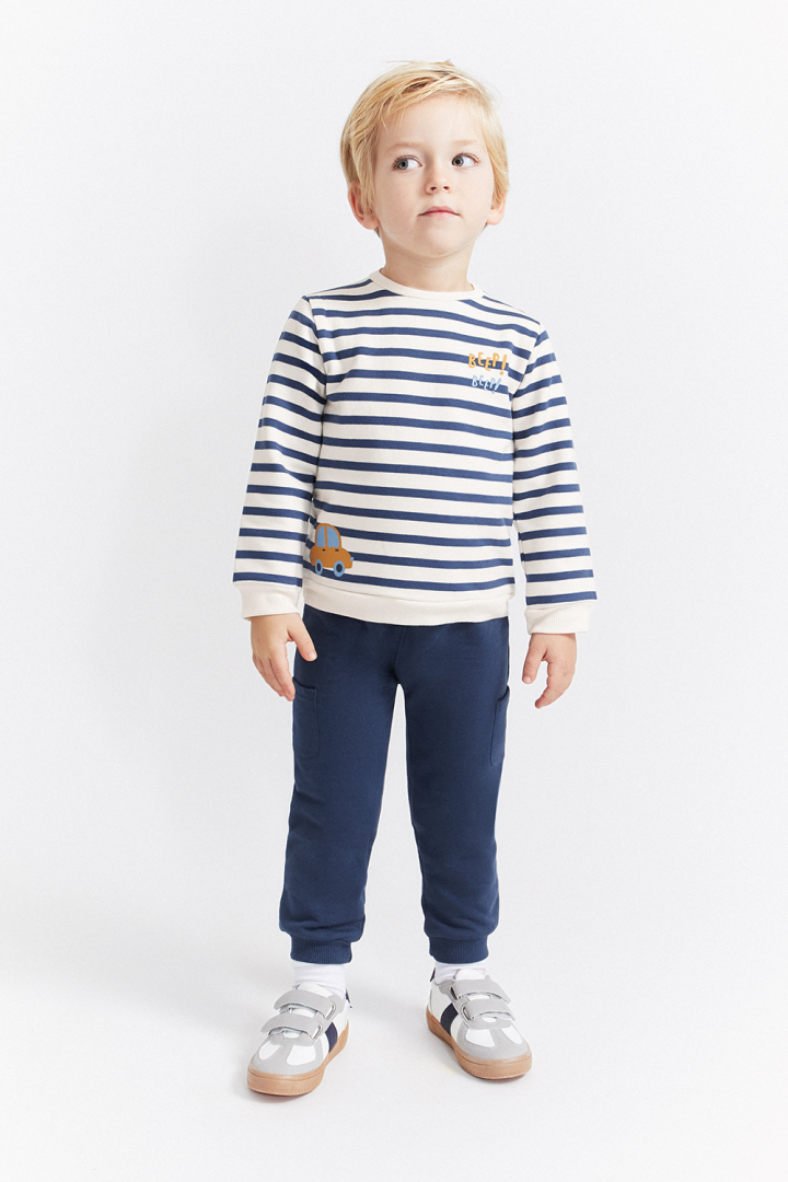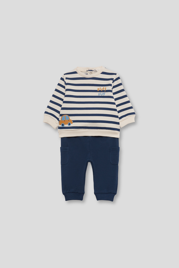 Sudadera de manga larga en color crudo con estampado de rayas azul noche y detalles gráficos de coche en la parte delantera. Cuello redondo con cierre trasero mediante botón, que facilita la puesta. El pantalón a juego en azul noche presenta un diseño tipo jogger con bolsillos laterales y cintura elástica para mayor comodidad.