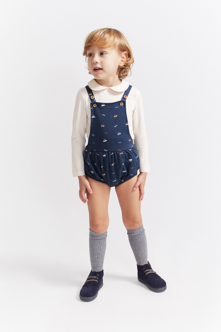 La ranita en color azul noche está estampada con pequeños coches y palabras bordadas, y cuenta con tirantes cruzados en la espalda y botones decorativos efecto madera en la parte delantera. La cintura y los camales son elásticos para mayor comodidad y sujeción.