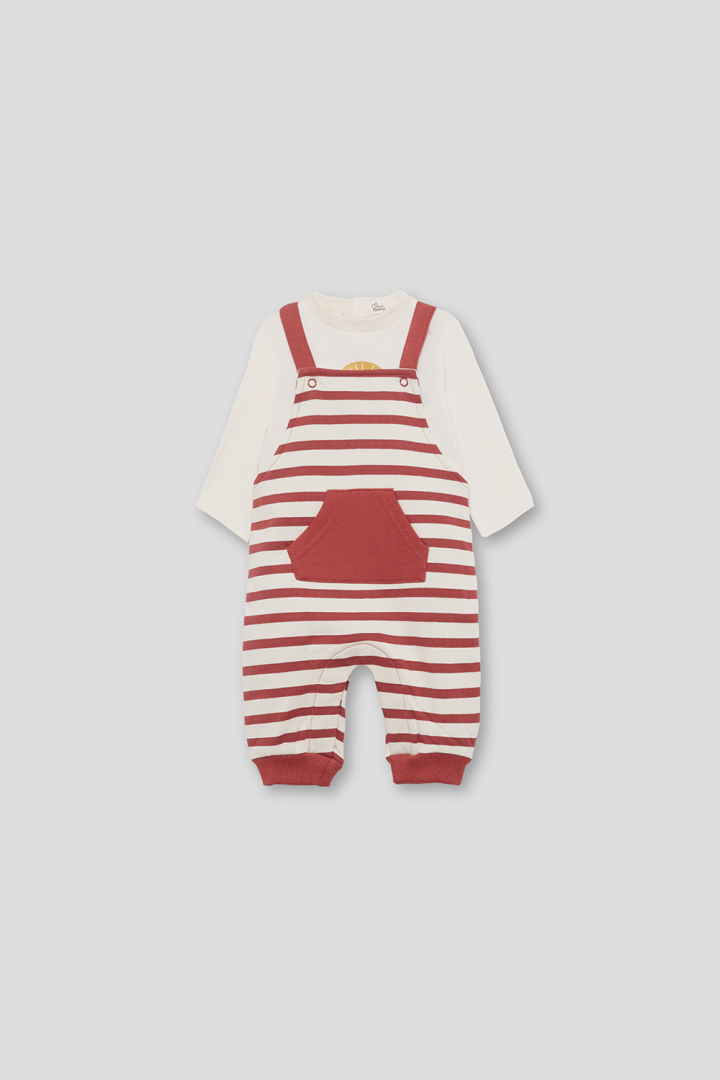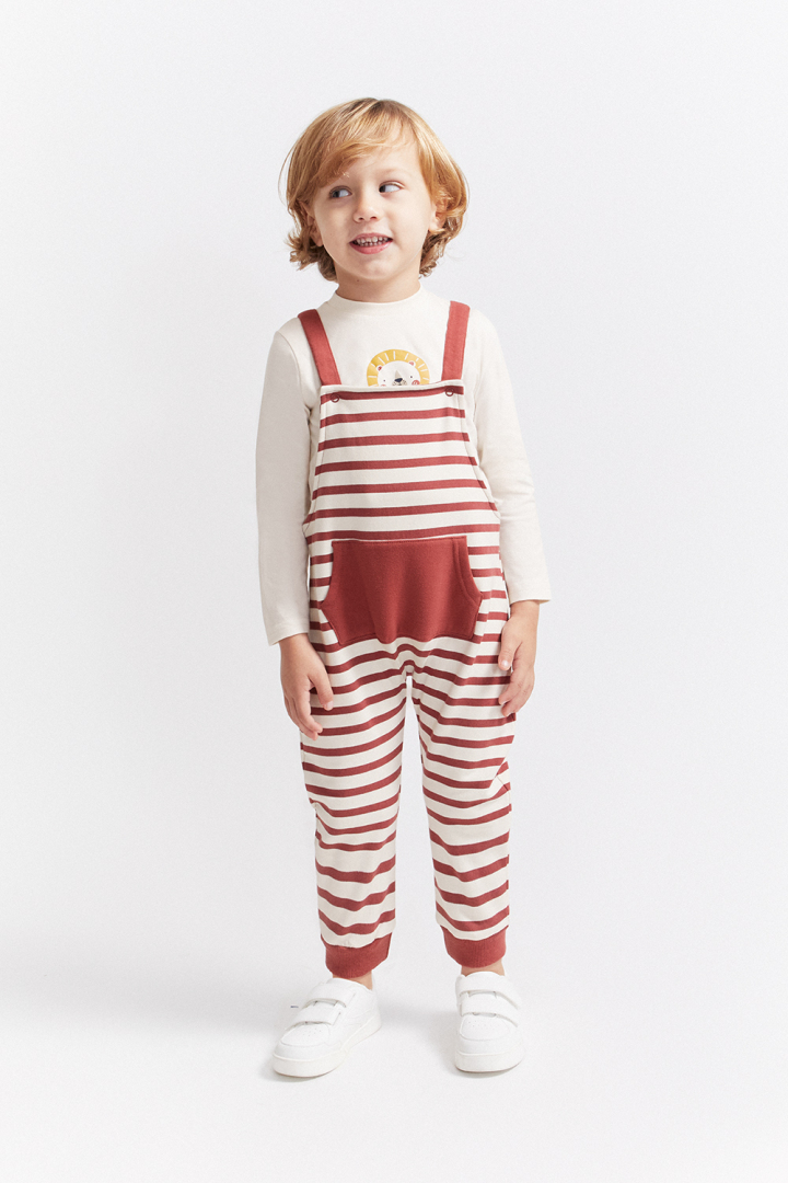 Este conjunto está compuesto por un peto largo de felpa en color crudo con rayas teja, tirantes con botones decorativos y un gran bolsillo canguro a contraste en la parte frontal. El bajo acabado en puño ofrece un ajuste cómodo para los más pequeños. La camiseta, en tono crudo, tiene cuello redondo, manga larga y un divertido estampado de león con detalle circular en el pecho. Incluye cierre trasero con automáticos para facilitar la puesta.