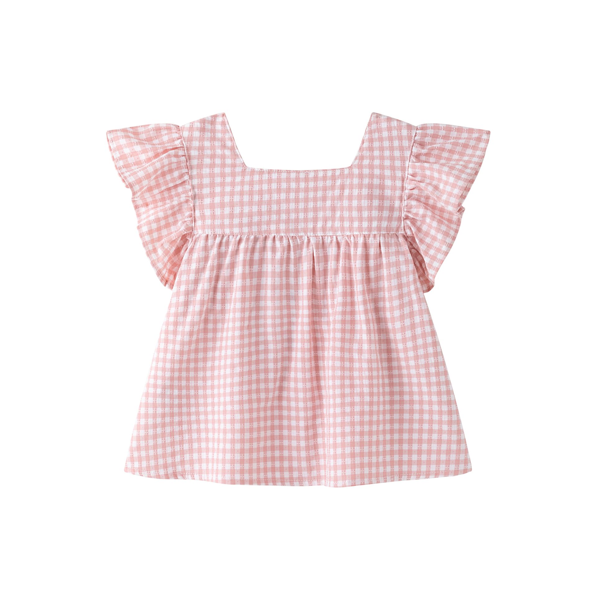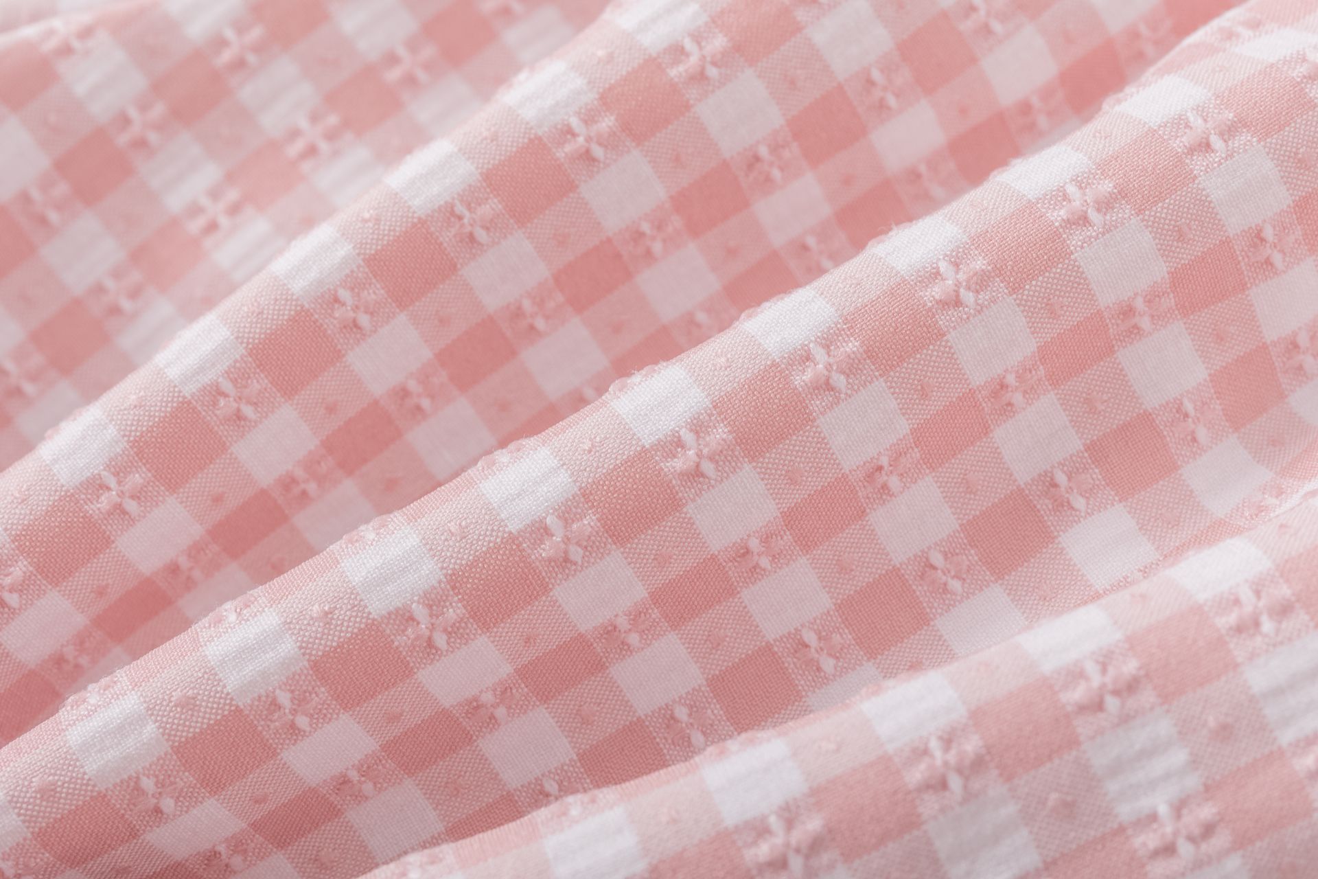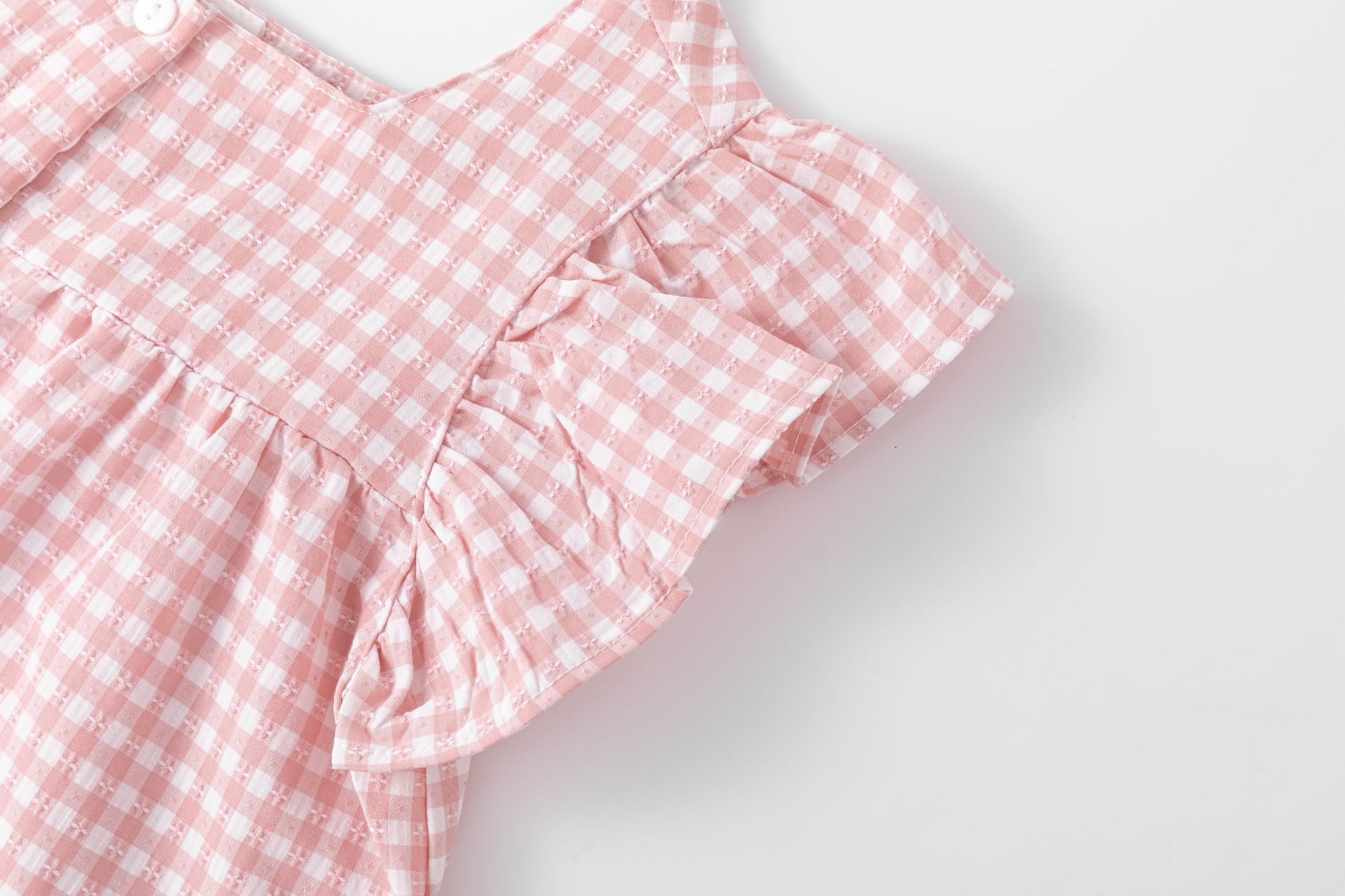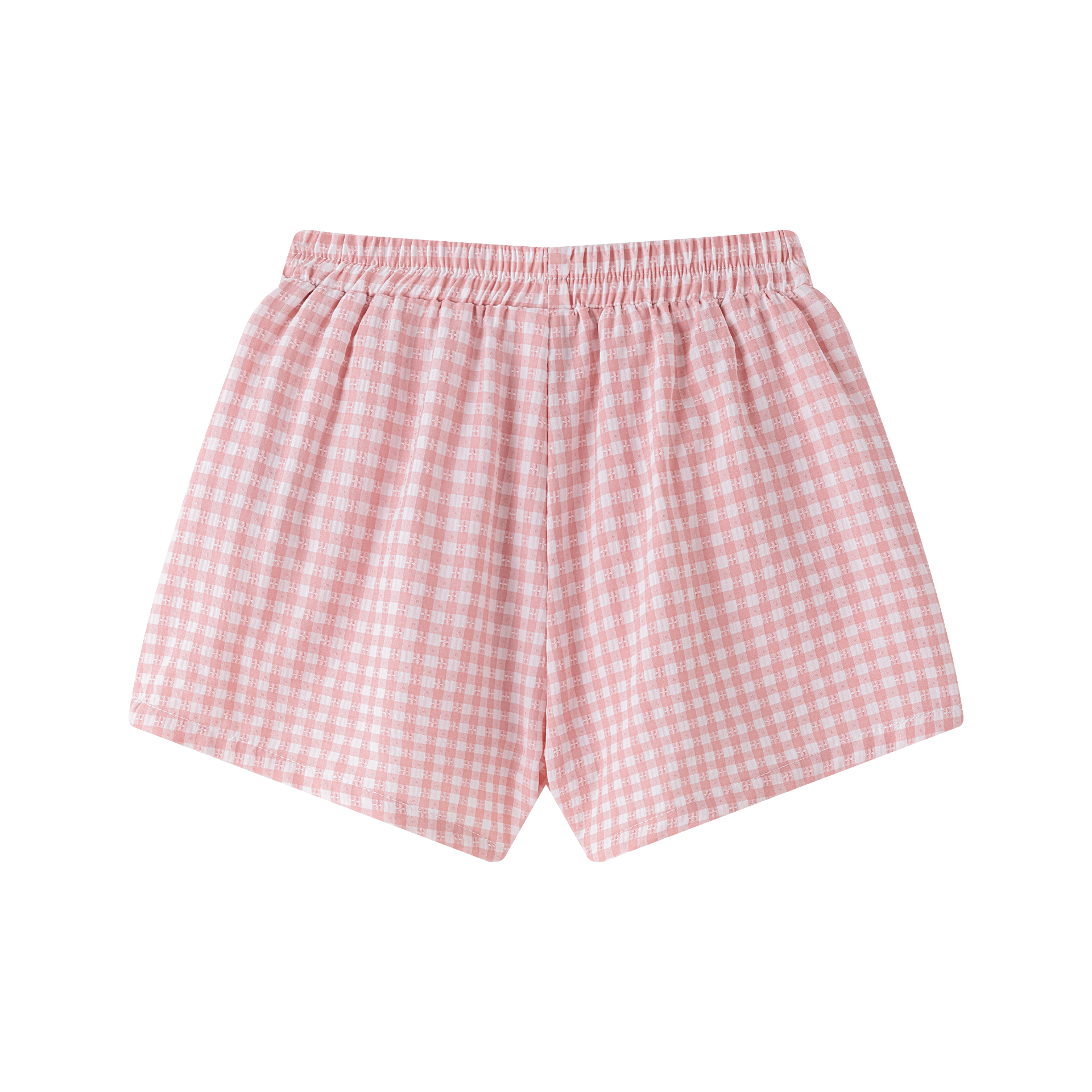 Conjunto de blusa suelta y short en cuadros vichy rosa pastel y blanco roto.