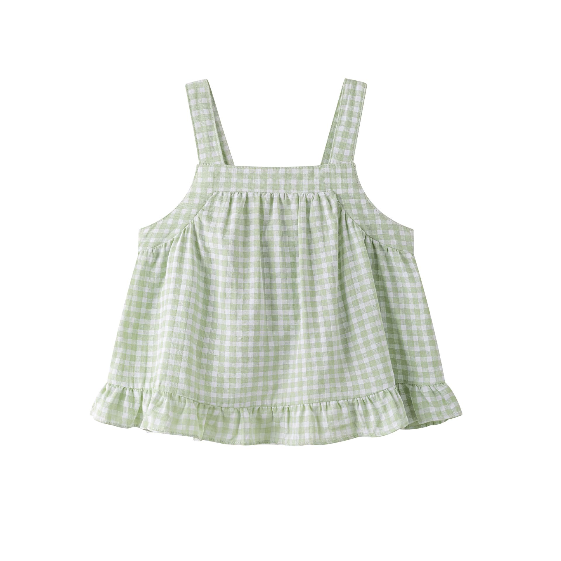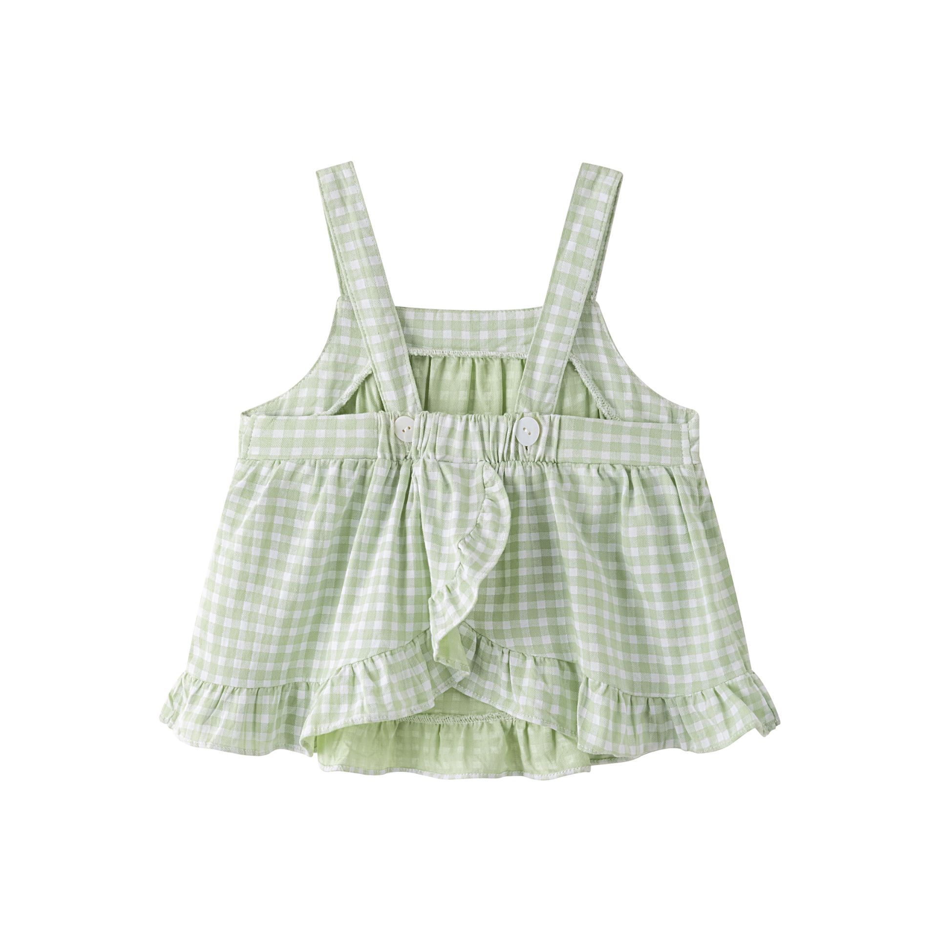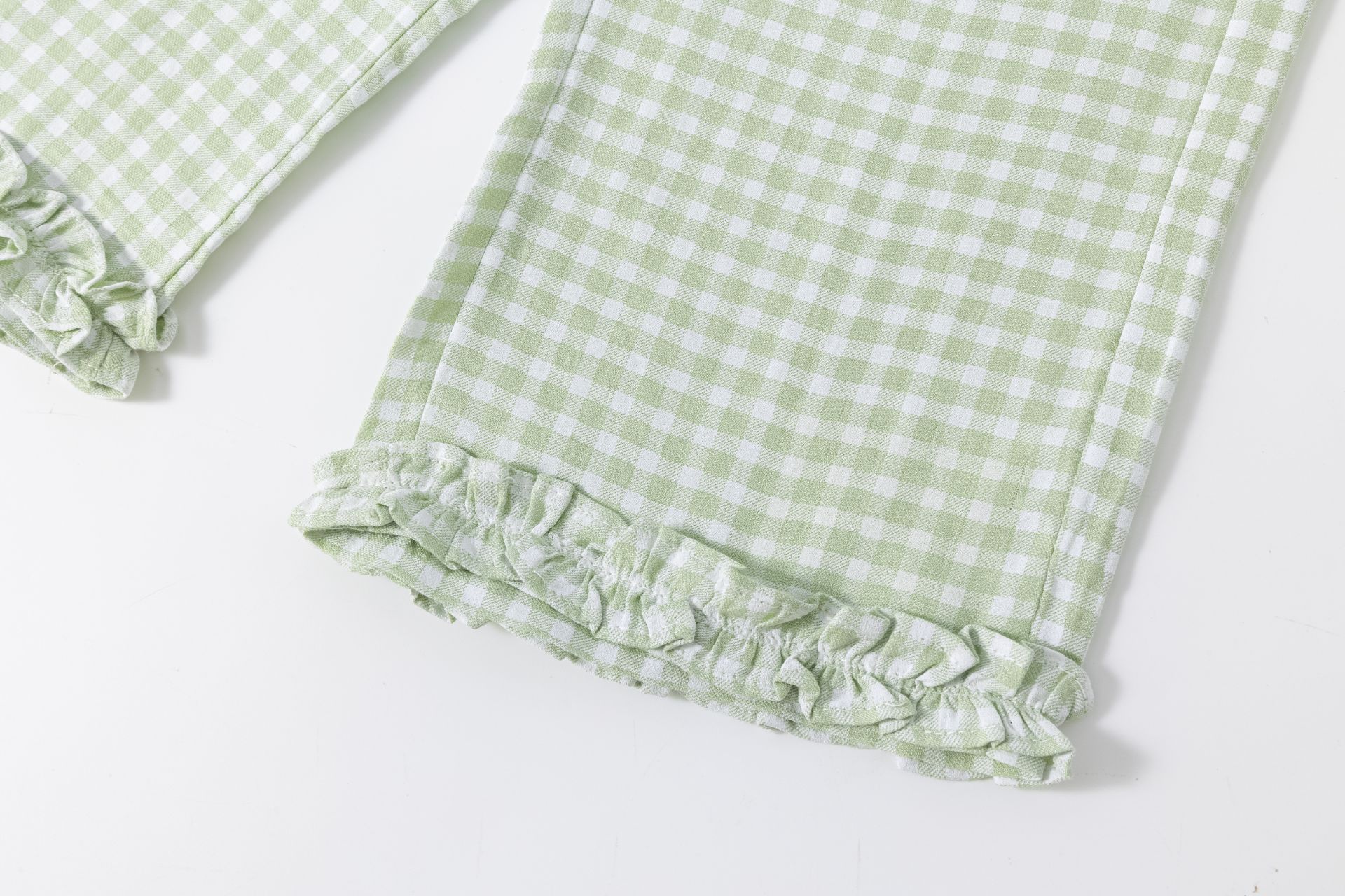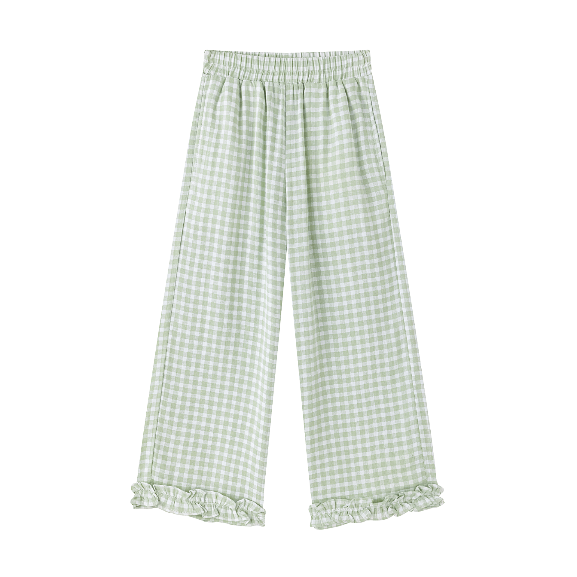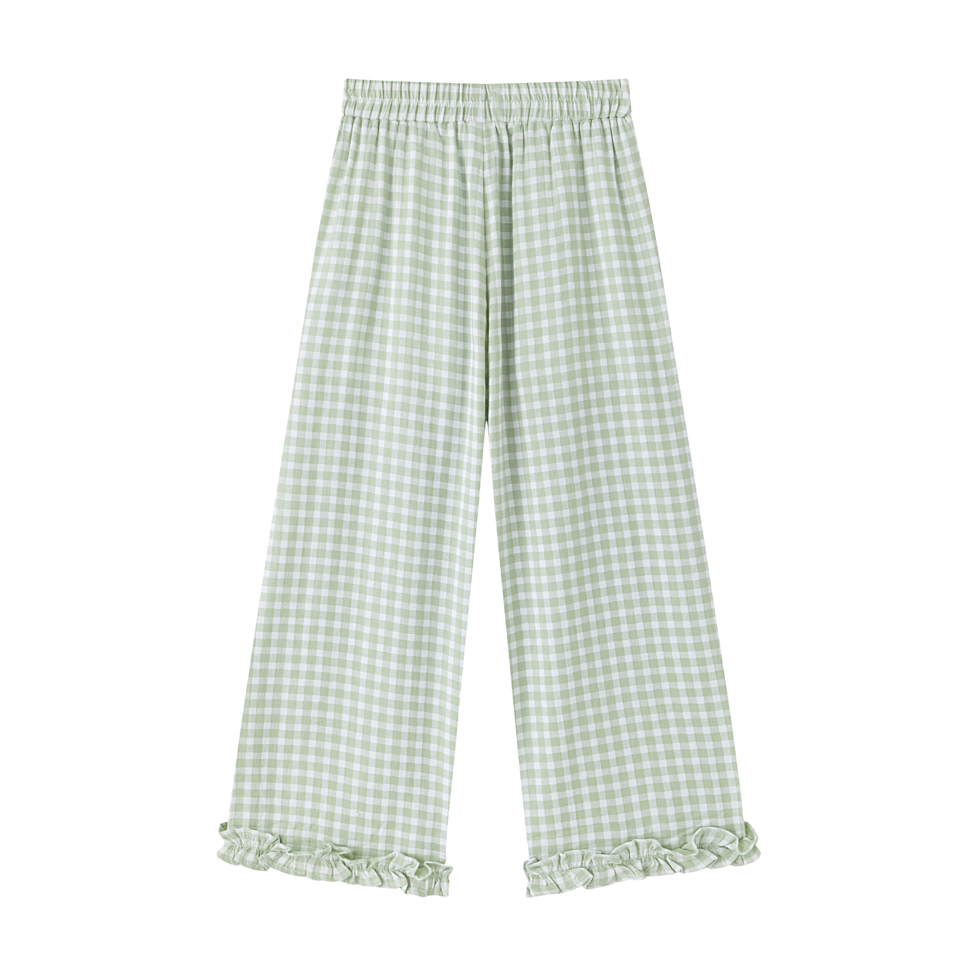 Conjunto de top y pantalón, el top va cruzado en la espalda con goma y un volante en el bajo, y el pantalón es de pata ancha, algodón-viscosa por lo que es muy fluido y suave, y lleva en el bajo un pequeño adorno del mismo tejido.