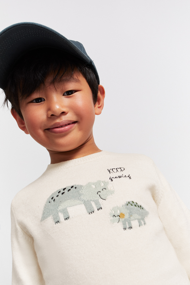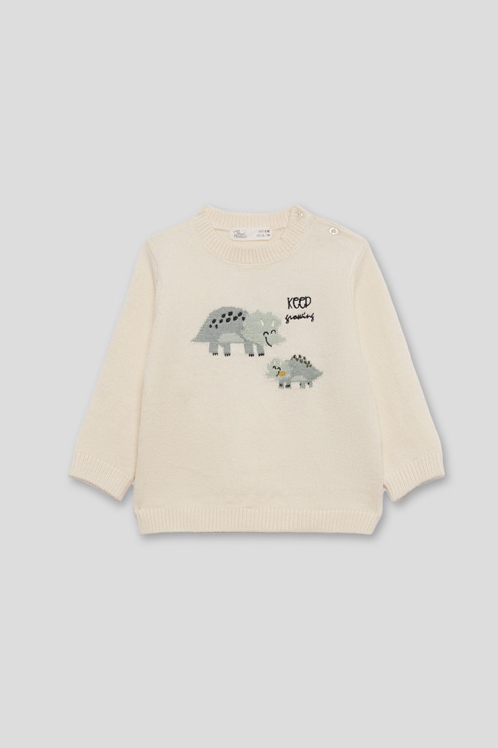 Jersey de punto, manga larga, cuello a la caja y abertura en hombro con botones, detalle dinosaurios en delantero.
