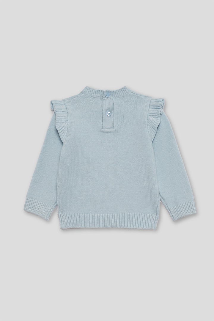 Jersey de manga larga en color azulina, confeccionado en punto suave y cálido para los días de invierno. En el frontal destaca un delicado cisne blanco con corona, bordado con detalles en relieve que aportan textura y ternura al diseño. Los volantes de canalé en los hombros le dan un toque especial y femenino.
