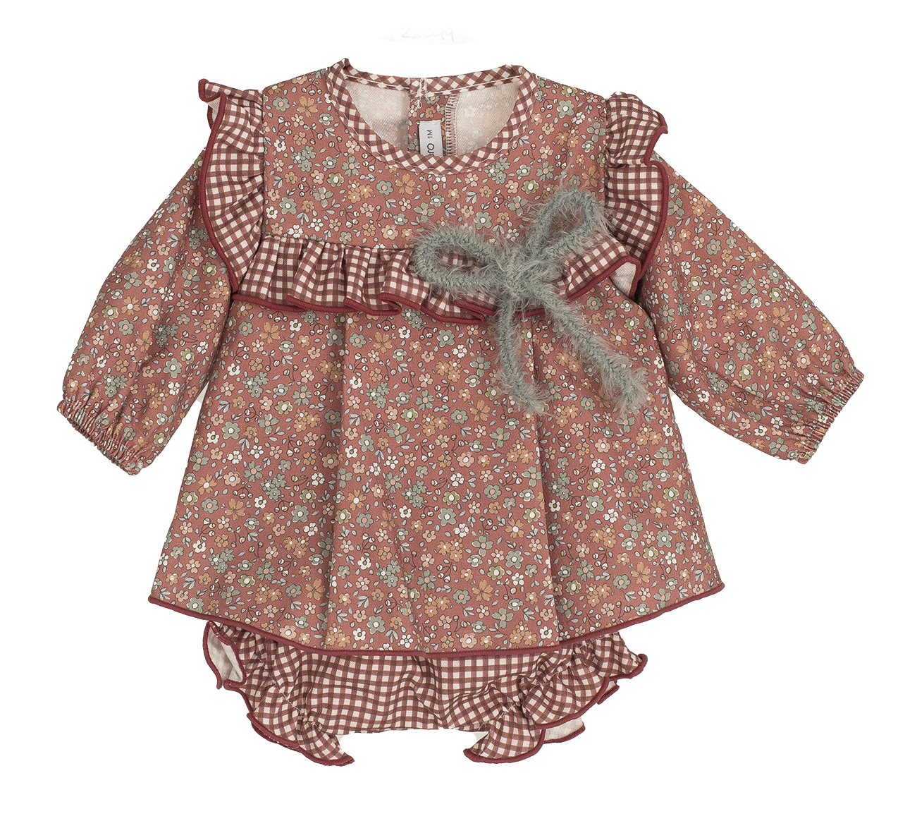 Jesusito Siroco, vestido corto en flores verde y fondo burdeos, adornado con volante de cuadros y lazo verde de la lana.