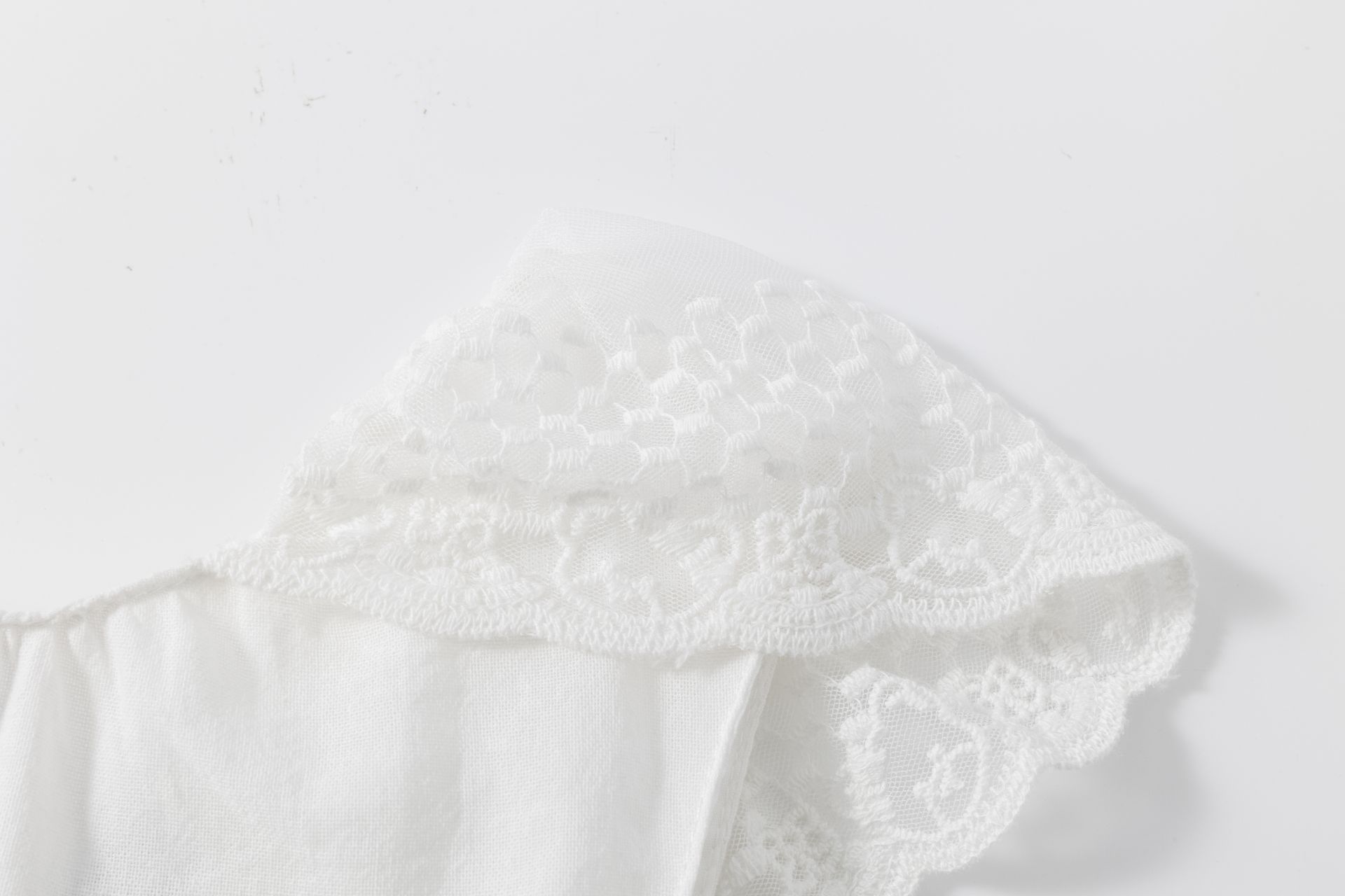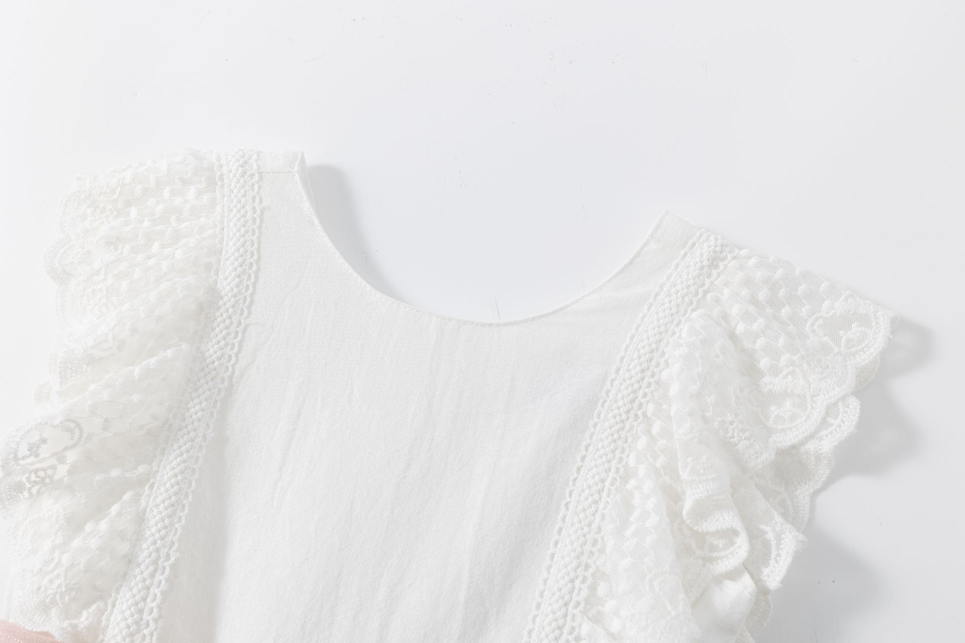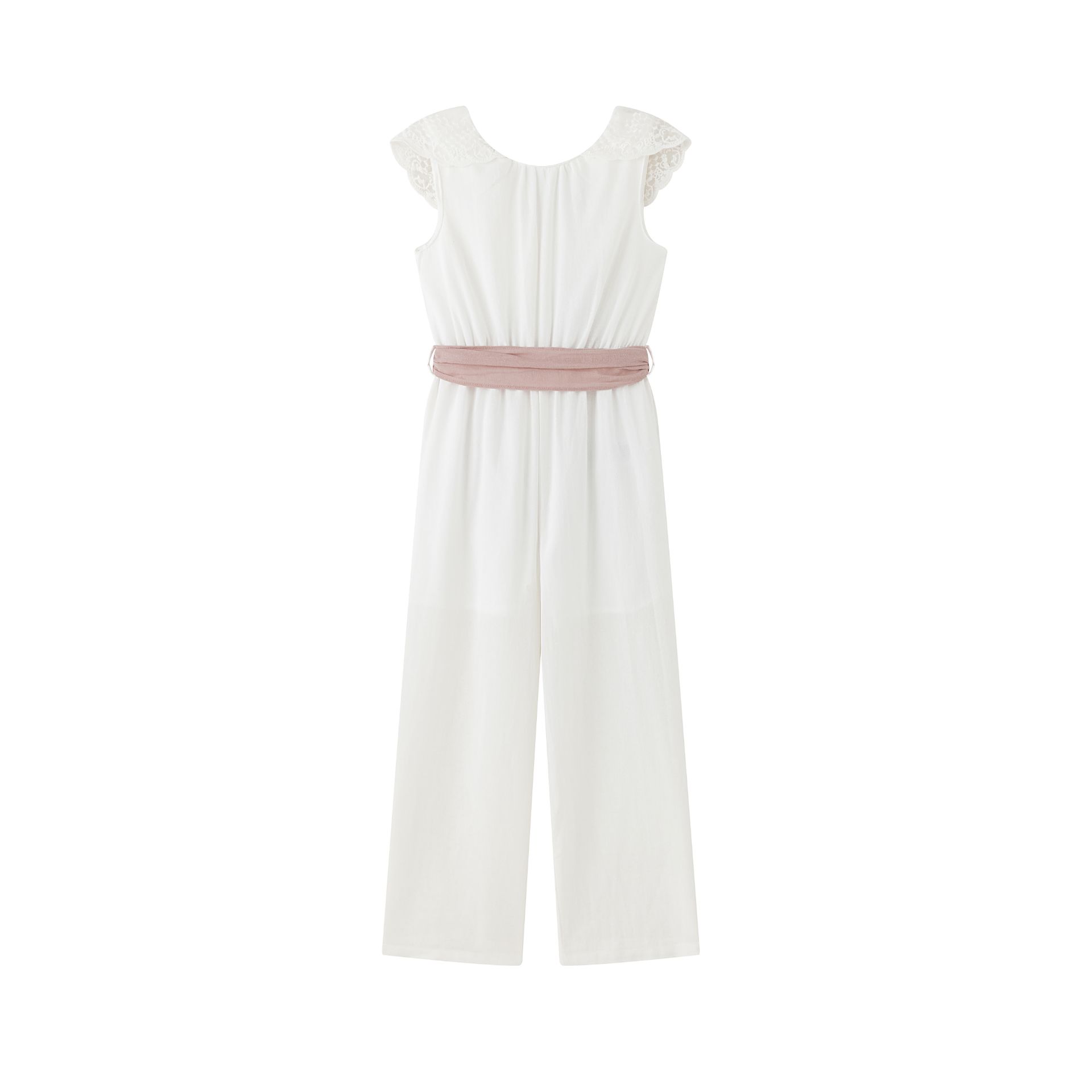 Mono de algodon 100%, guipur en la sisa y escote espalda, adornado con cinta de algodón en la cintura en rosa palo. Forrado hasta media pierna.