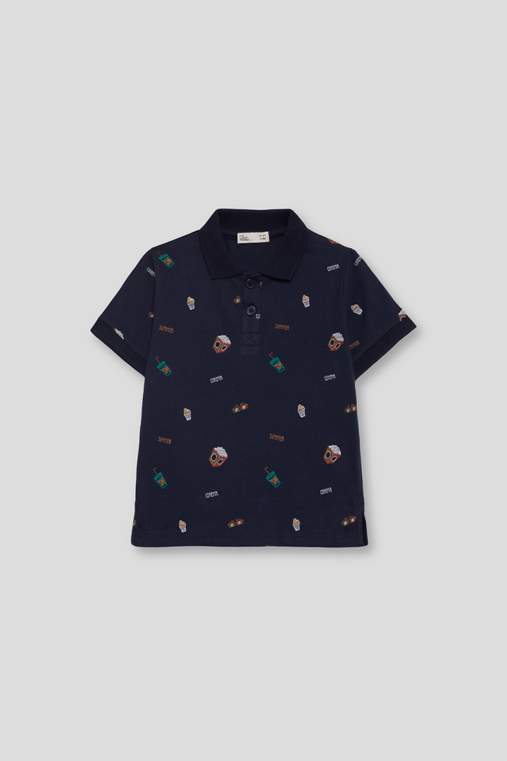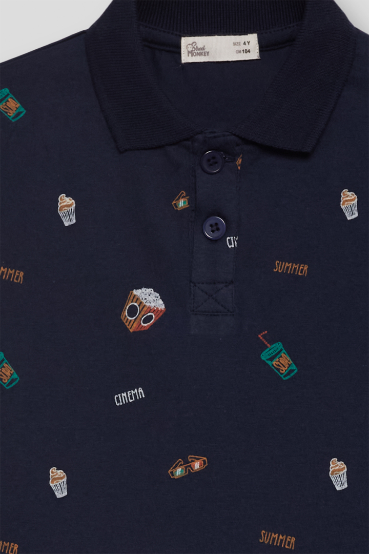 Polo manga corta, color azul marino, estampado de paquetes de palomitas.