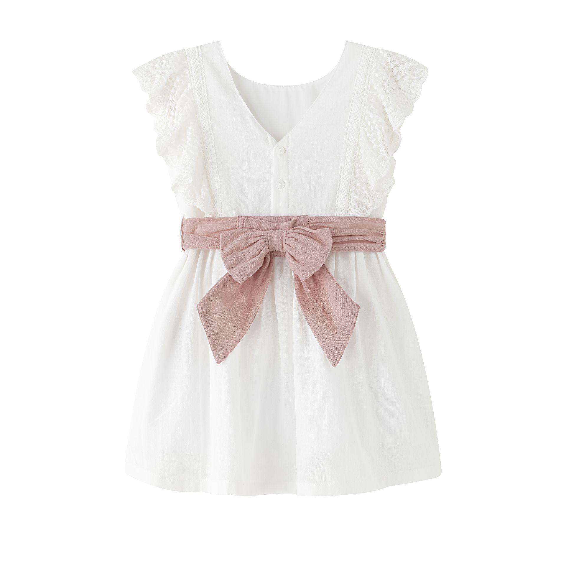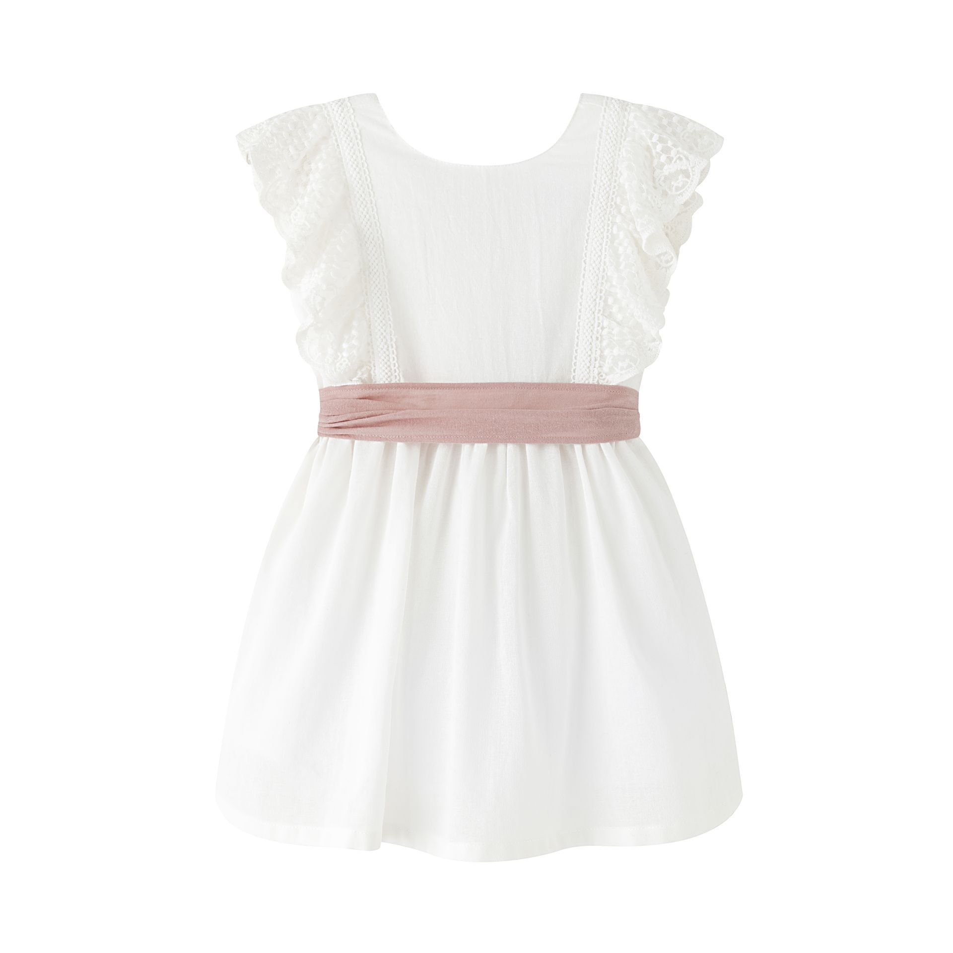 Vestido blanco 100% algodón, lateral adornado con guipur desde la cintura hasta el hombro, cinturón de algodón rosa empolvado.