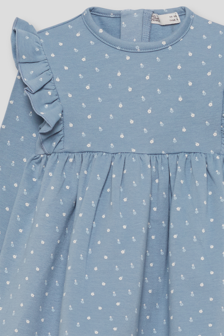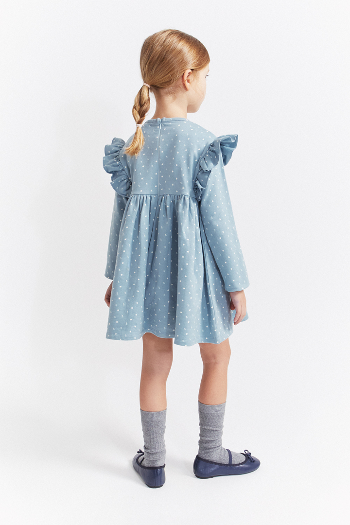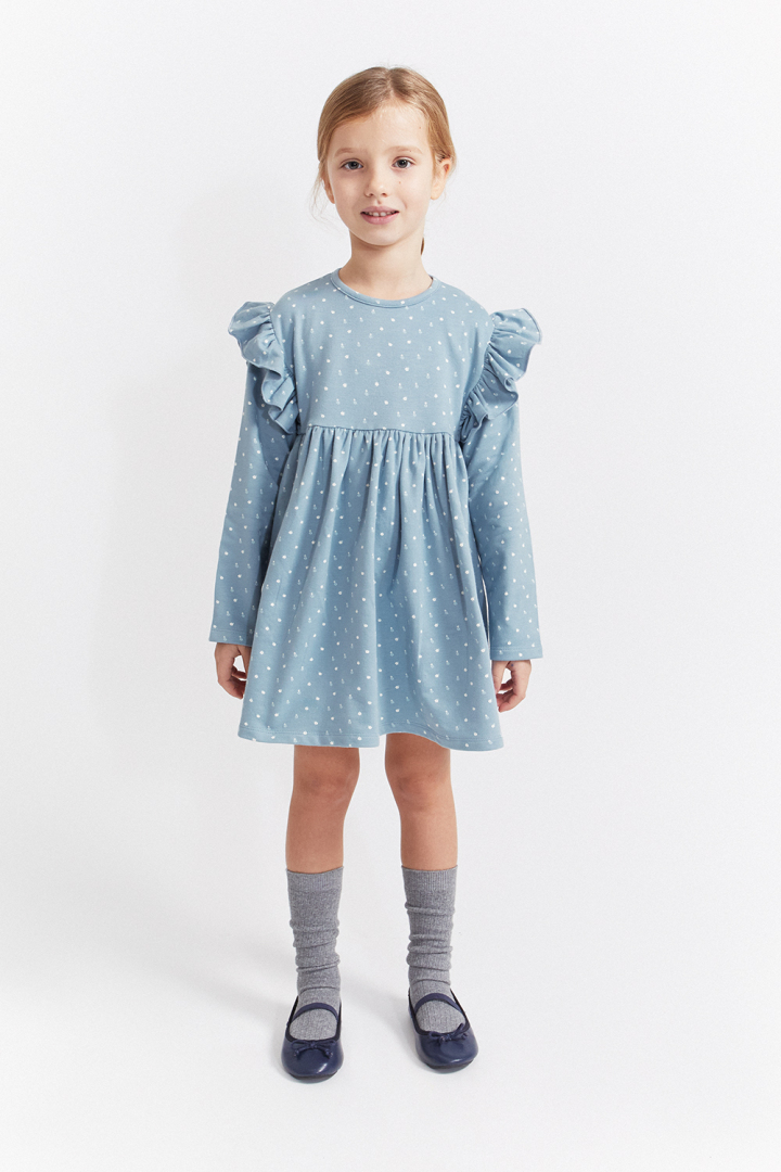 Vestido en color azulina con un delicado estampado de pequeños corazones blancos, ideal para los días frescos. Presenta un bonito diseño con volantes en los hombros que aportan volumen y un toque femenino. El corte bajo el pecho da paso a una falda con mucho movimiento, perfecta para sus juegos y aventuras.
