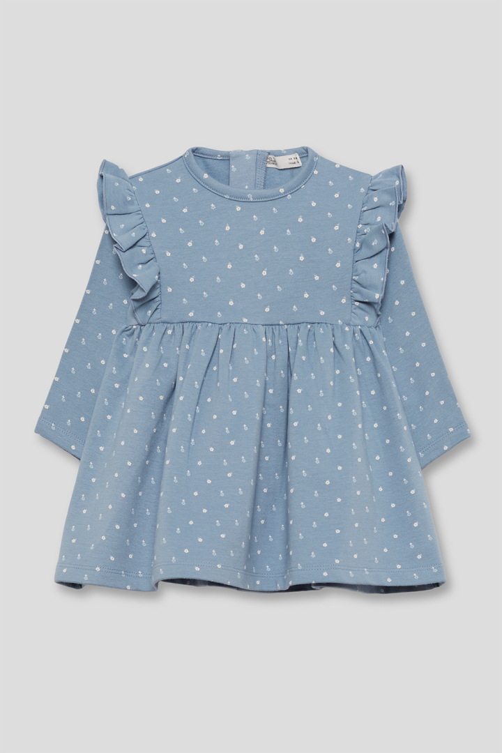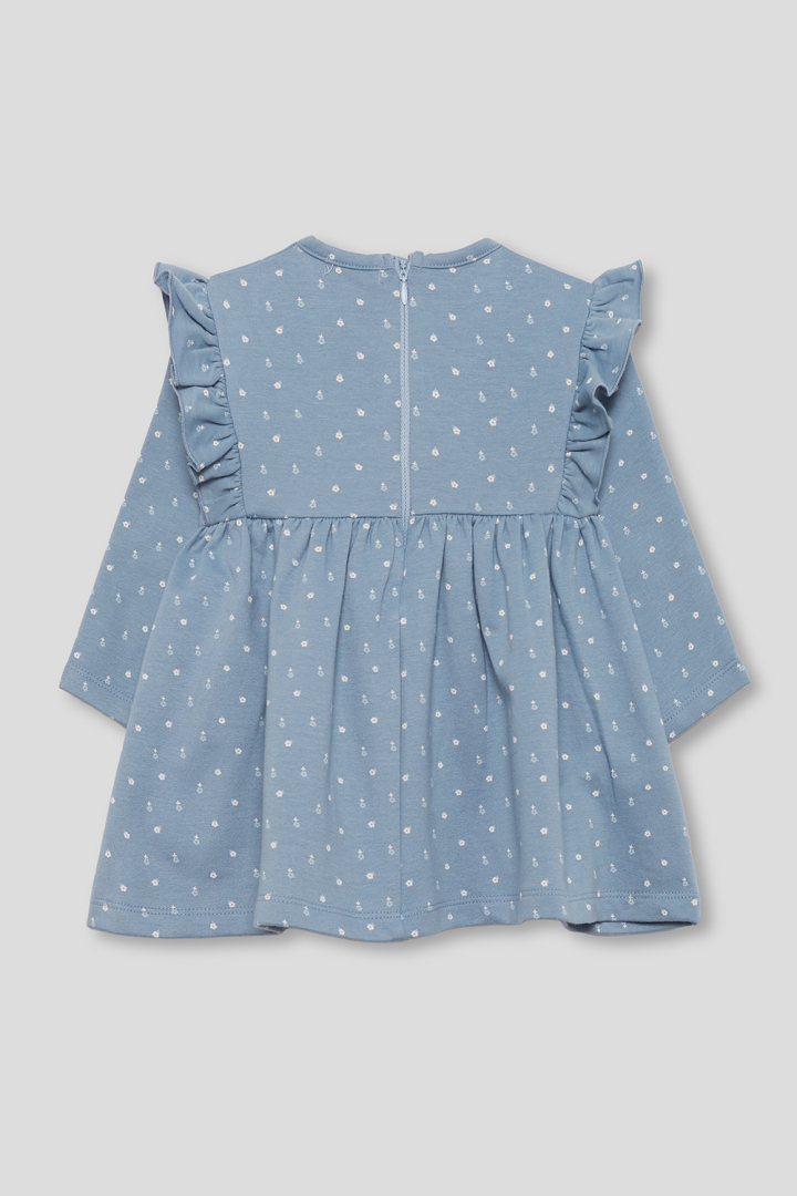 El vestido incluye cuello redondo y cierre de botones en la espalda en las tallas de meses, facilitando la puesta diaria.