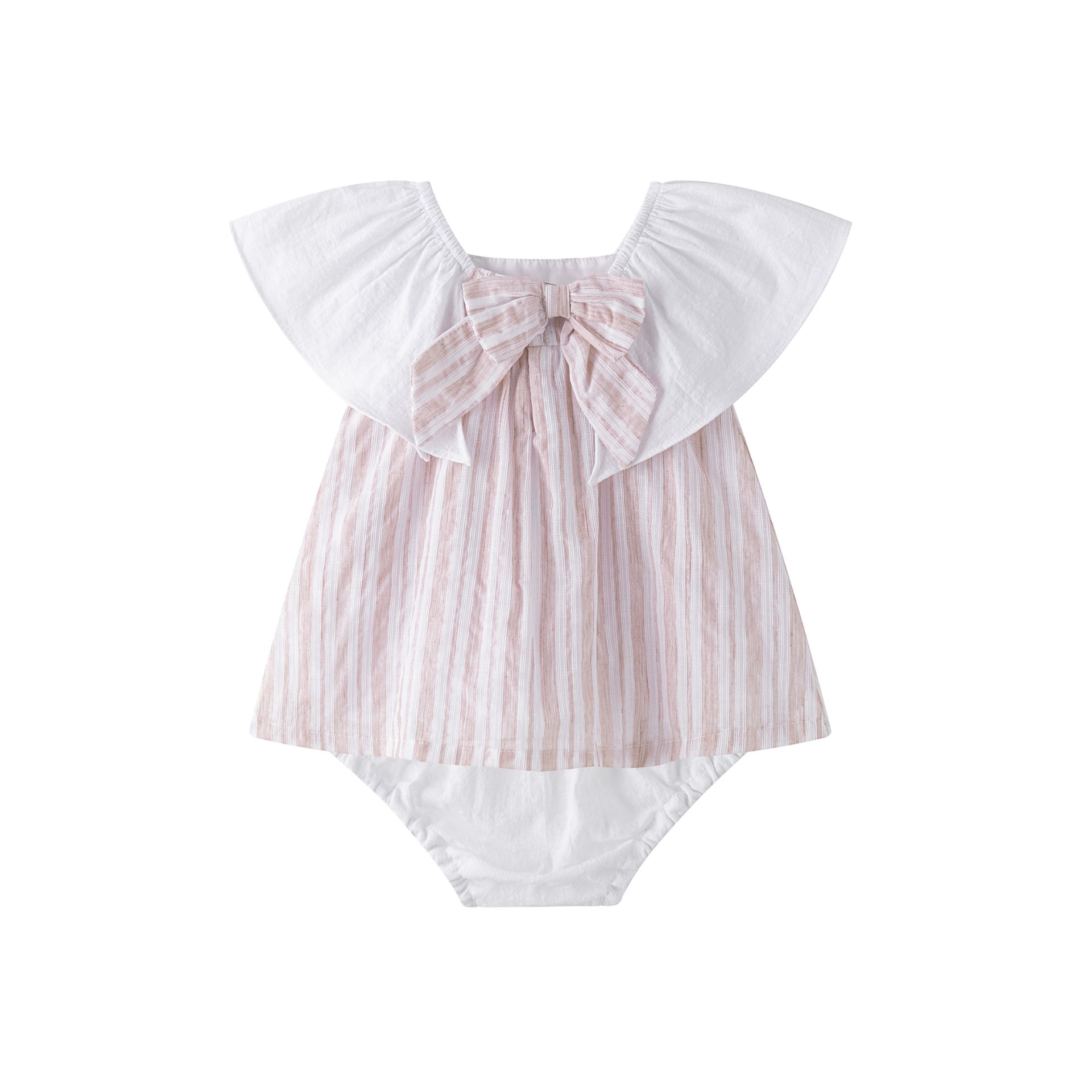 Vestido de popelin de algodón en rayas rosa y blanco, mangas de volante suelto que cae en el hombro, lazo superpuesto con imperdible para poderselo cambiar de sitio.
