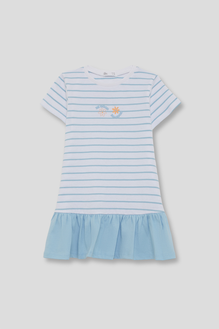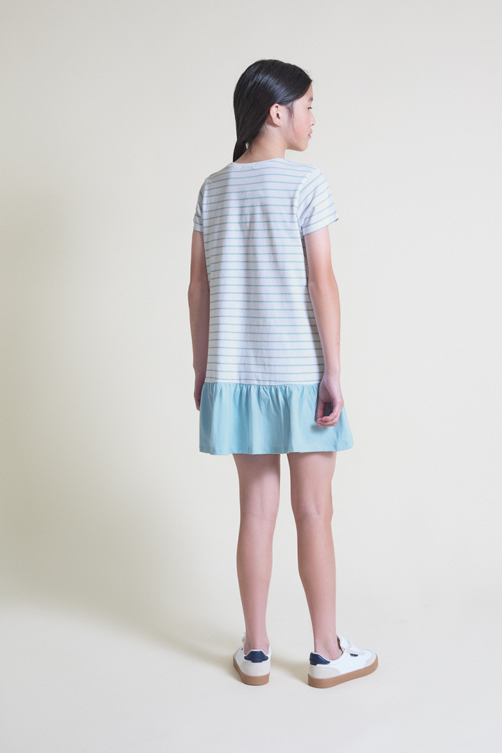 Vestido manga corta, cuello a la caja, color blanco con rayas azules y bajo con volante a juego.