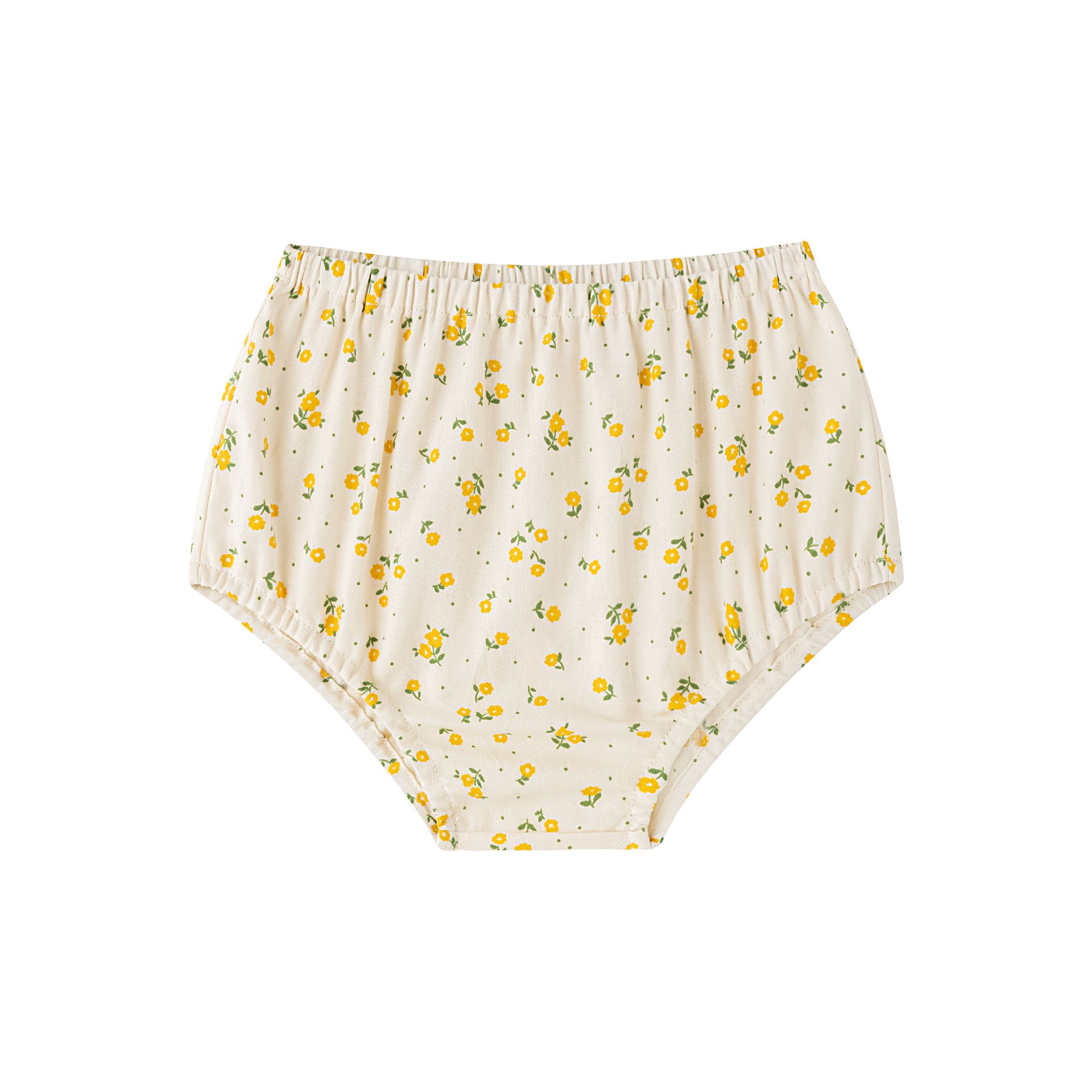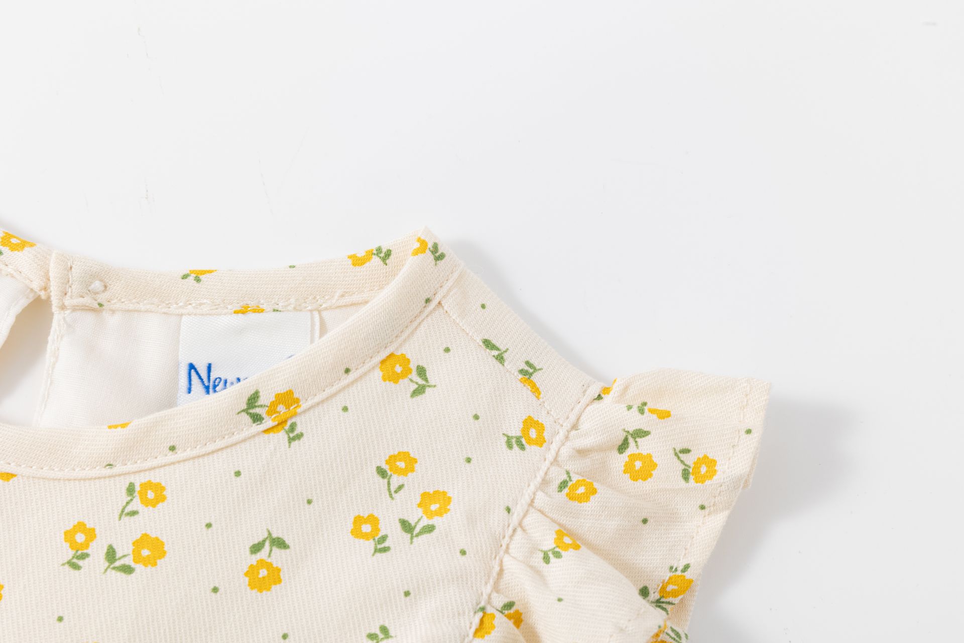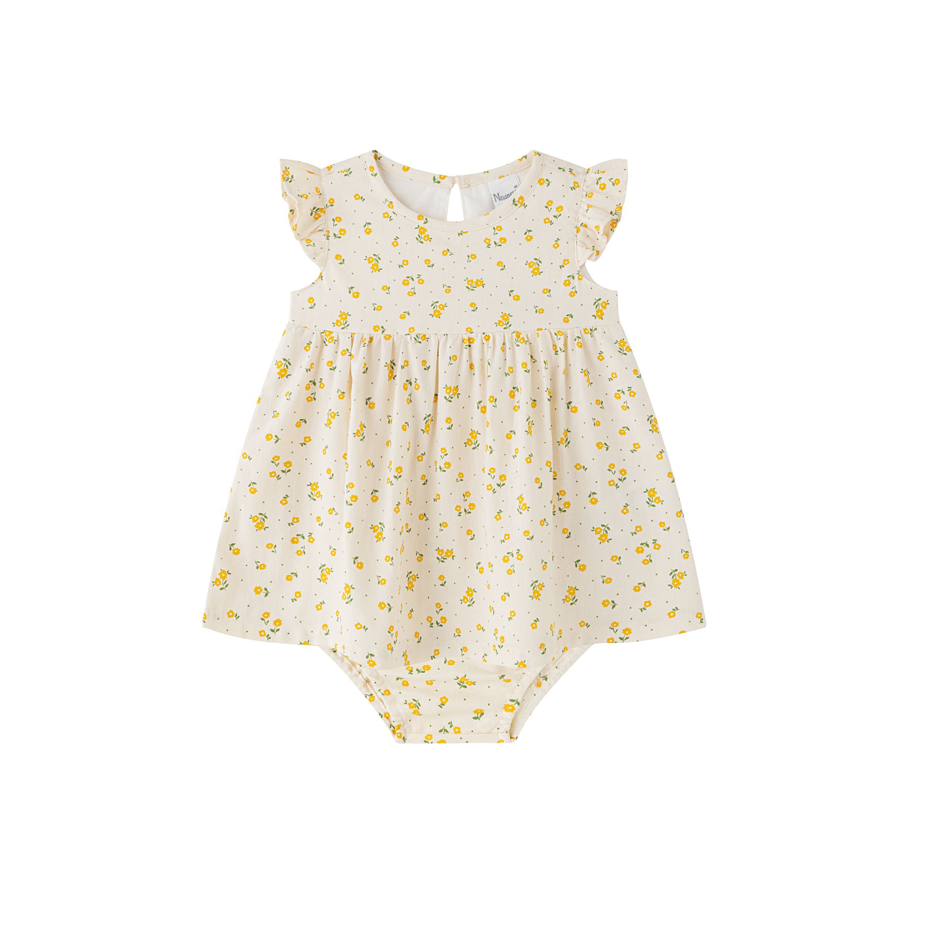 vestido manga sisa con volante, cierre con botón por detrás, y braguita a juego, y estampado de flores mostaza.