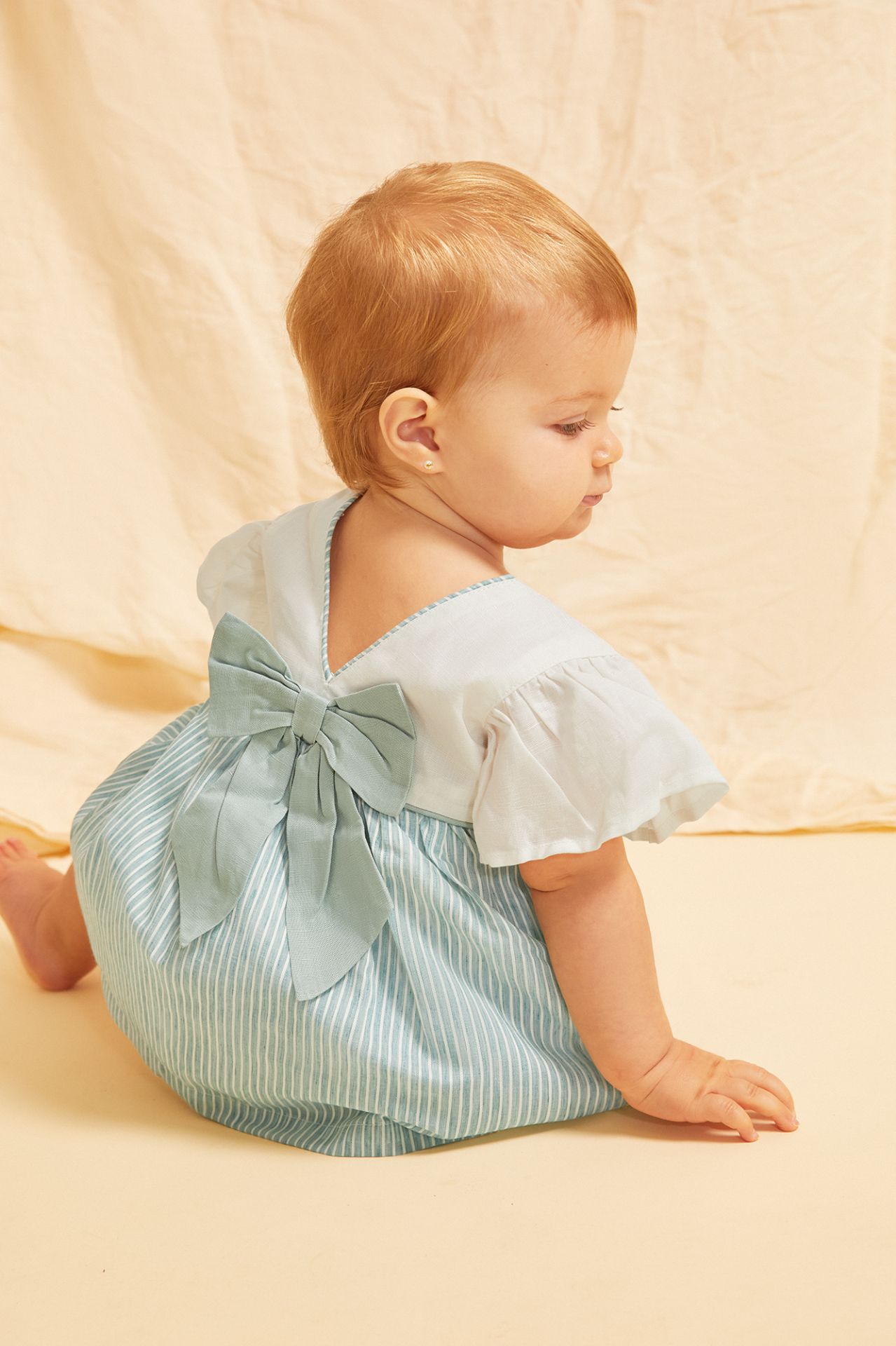 Vestido de ceremonia, cuerpo blanco y manga volante, falda en rayas verde agua y braguita a juego.