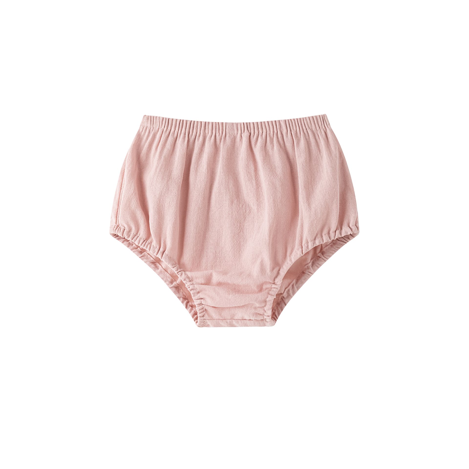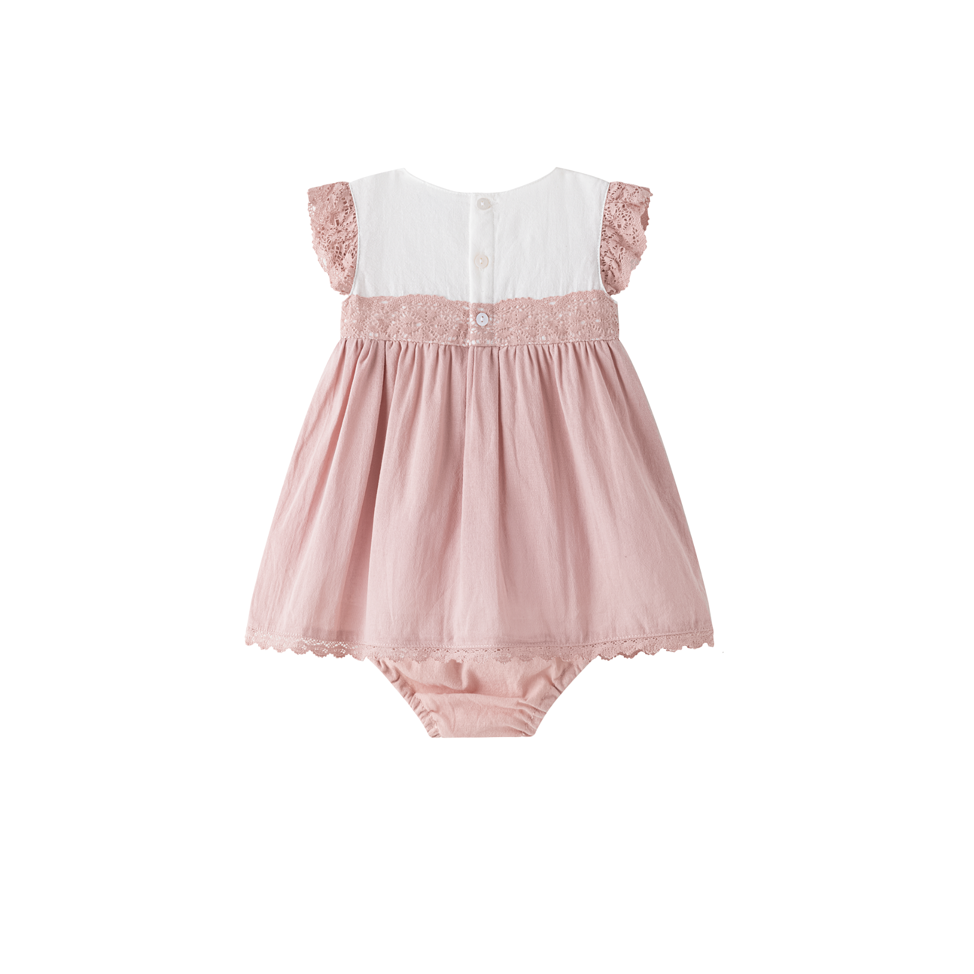 Vestido de ceremonia en lino color rosa empolvado y pechera en blanco roto. Tirabordada en rosa a juego en corte y sisa, a juego braga en lino rosa.