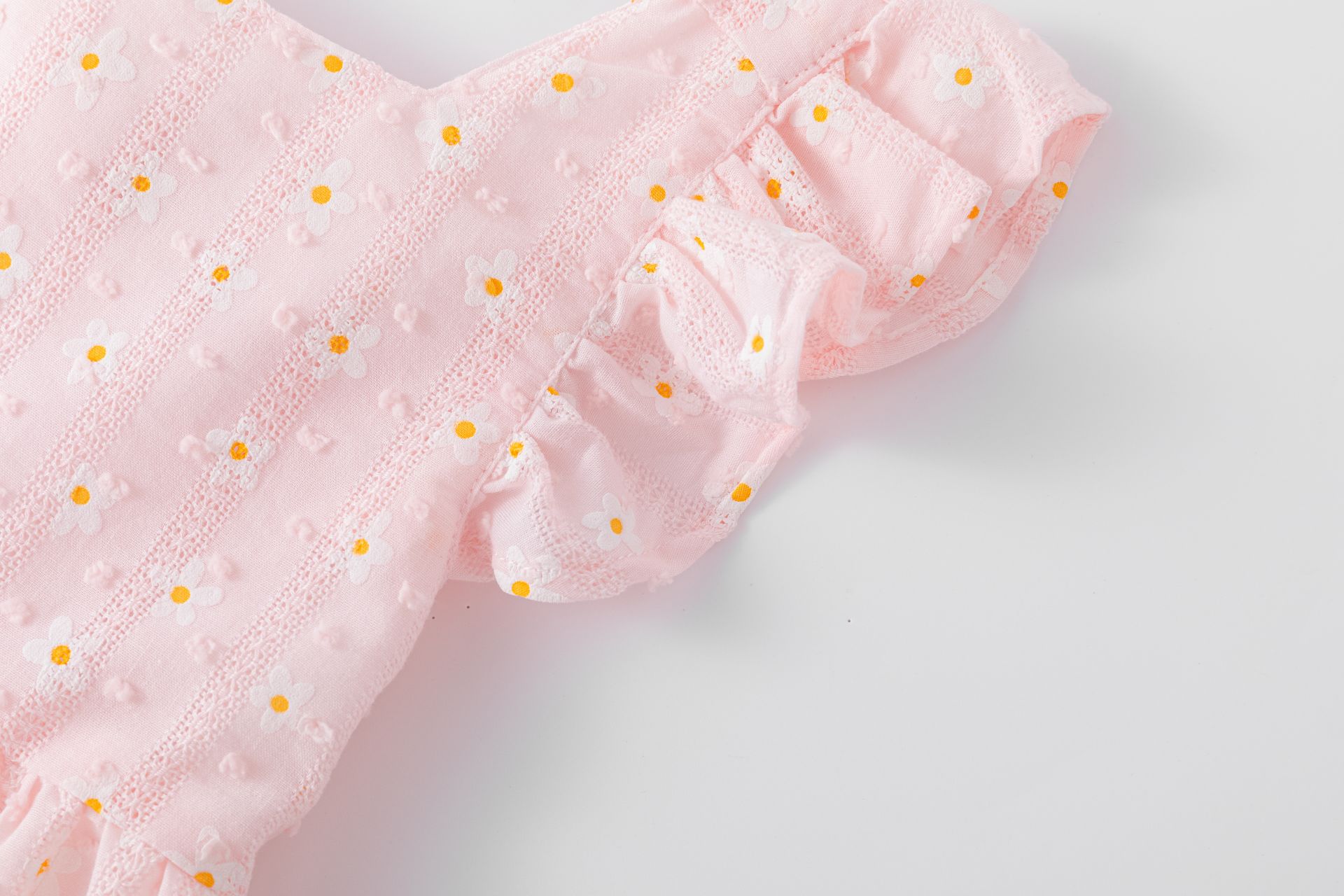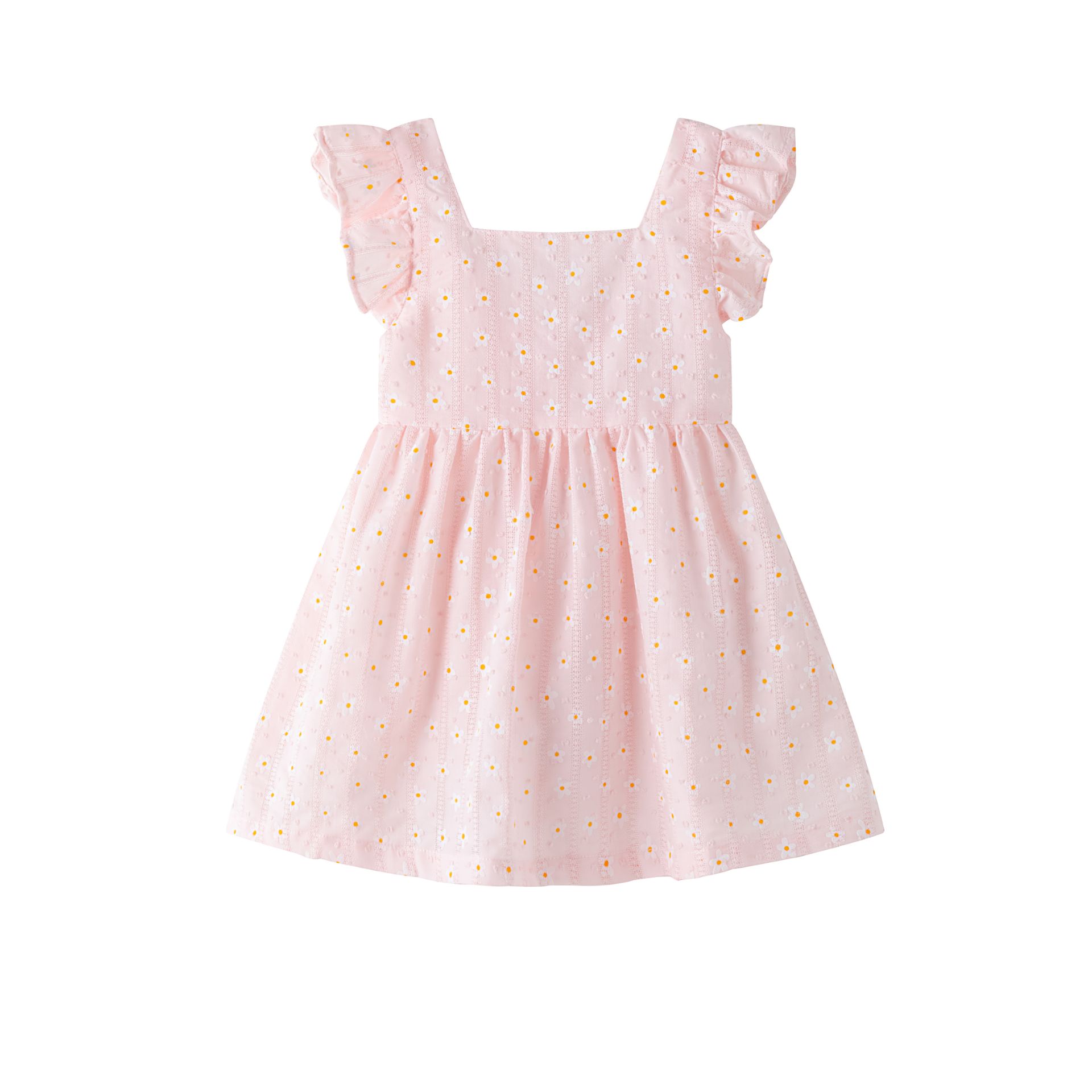 Vestido manga sisa con volantes, espalda con lazo y estampado de margaritas.